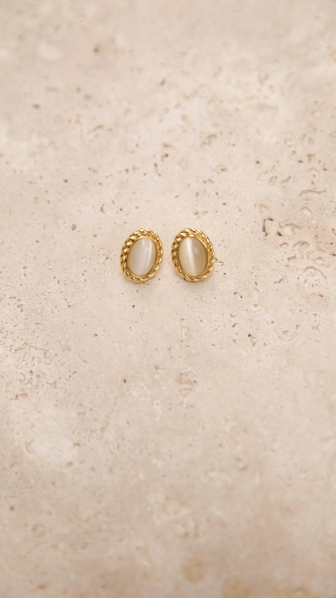 Embrace timeless elegance with these 18K gold-plated vintage-inspired earrings, featuring polished oval stones and a braided outer design. Perfect for adding a romantic and sophisticated touch to any outfit.