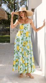 Design Note — Vibrant aqua and lemon florals define this straight-neck maxi, cut from breathable cotton for a tiered, flowing finish. A shirred back panel and adjustable straps secure the bodice for a flexible, custom-feeling fit.