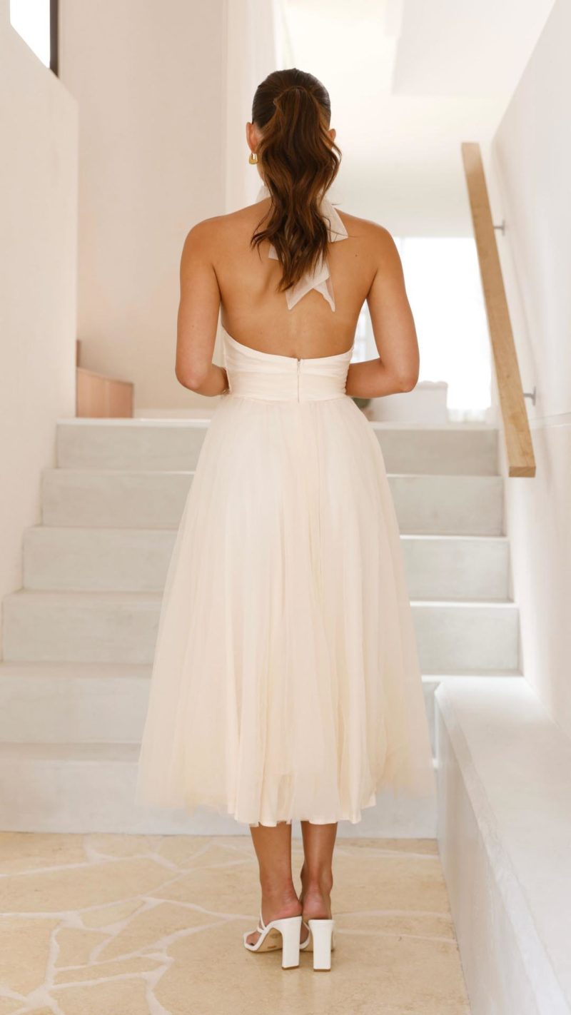 Turn heads in this beige tulle midi dress, designed with a chic sheer halter neck tie, soft bust cups, and a flattering fitted waistband. Perfect for making an elegant statement at any event.