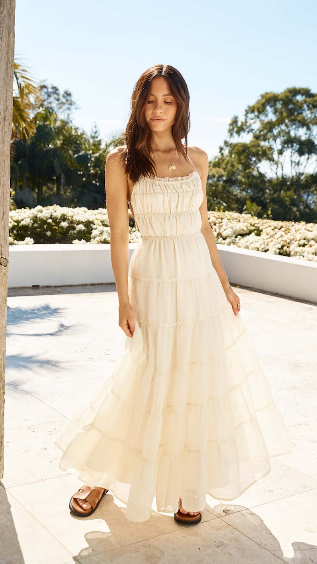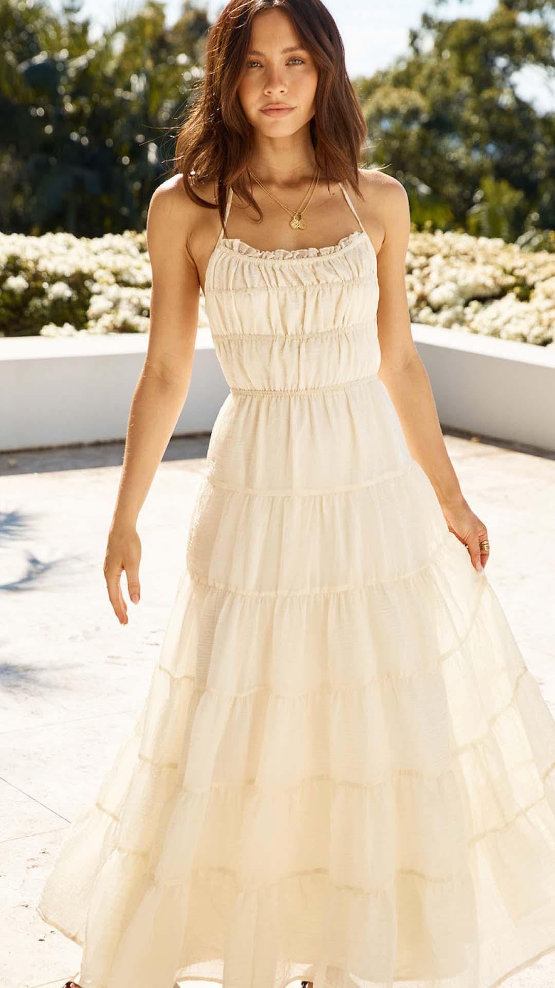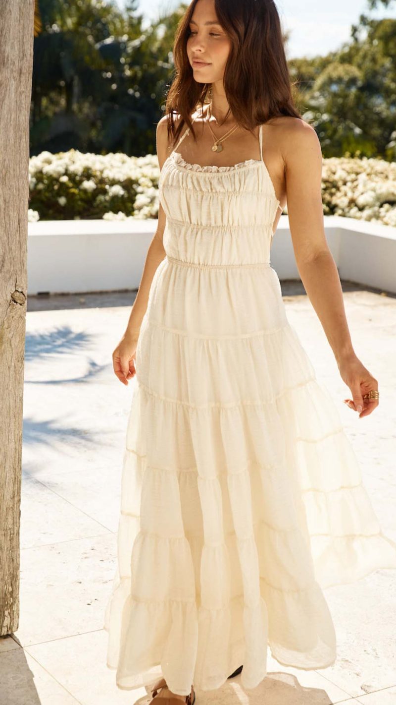 Slender string ties calibrate the open back for exact tension, anchoring a shirred bodice that shapes the torso before releasing into a tiered skirt. The lightweight fabric allows the sweeping hem to catch the air, projecting effortless occasion grace.