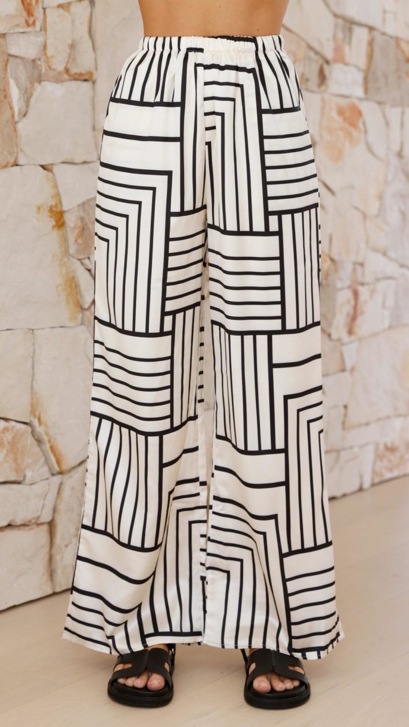 Relax in style with our Black and White Geometric Pajama Set. Featuring a collared shirt with functional buttons and wide-leg, high-waisted pants, this set offers ultimate comfort and chic design. Perfect for lounging or a good night’s sleep.
