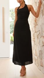 Embrace timeless sophistication with this black halterneck maxi dress. Its asymmetrical neckline, side gathers, and shirred back panel create a sleek, flattering silhouette, while the hidden zipper ensures a polished finish.