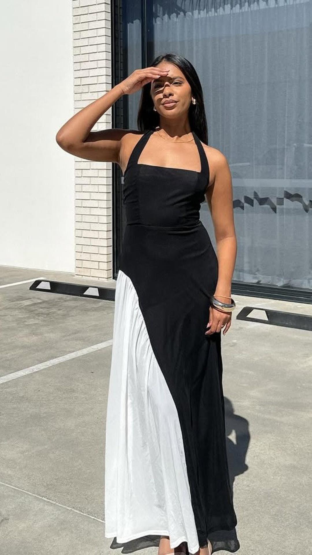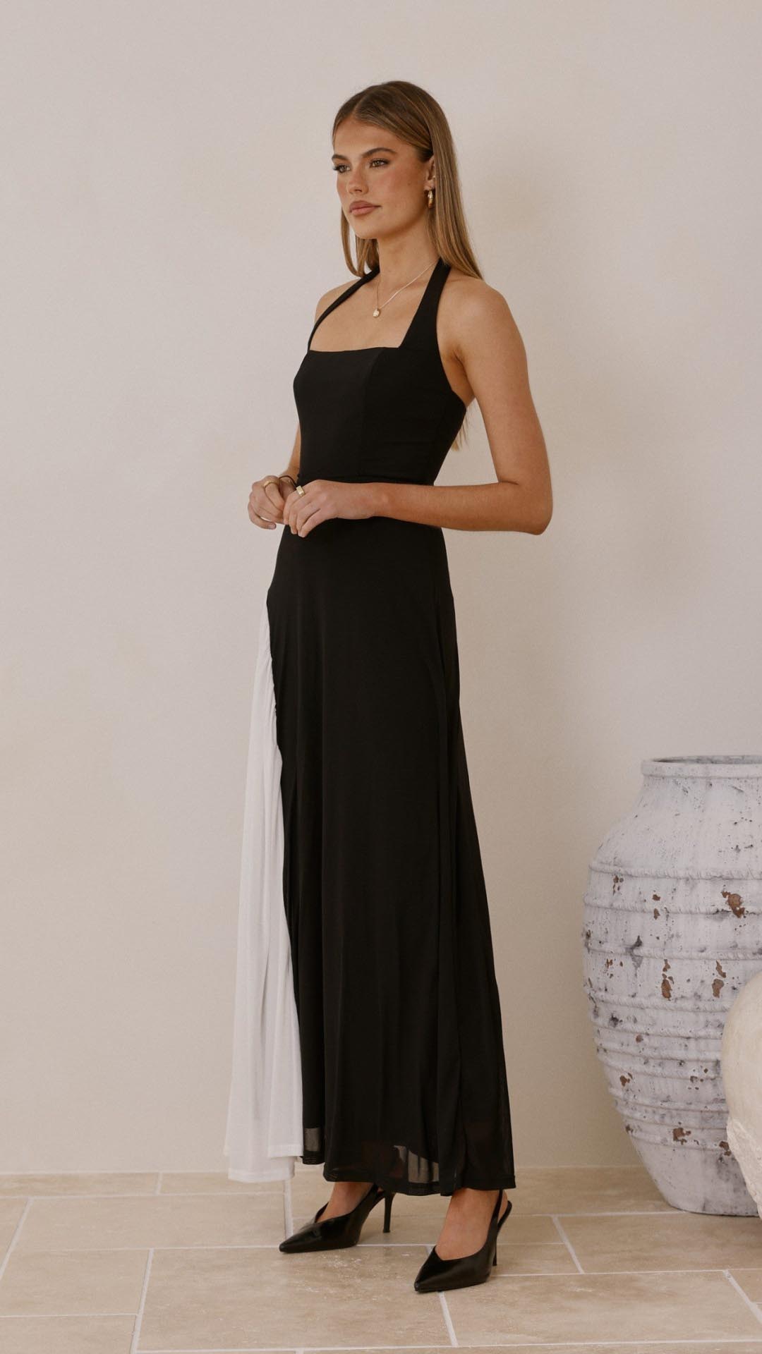Design Note — Turn heads in this elegant black contrast halter maxi dress, featuring a secure silicone grip, flowing mesh overlay, and sleek invisible zip closure.