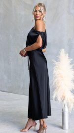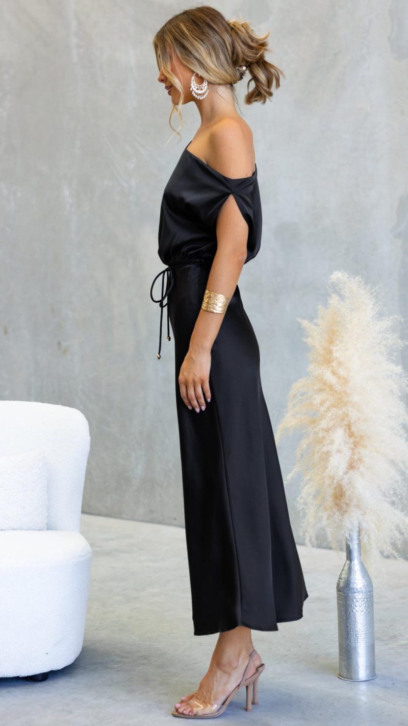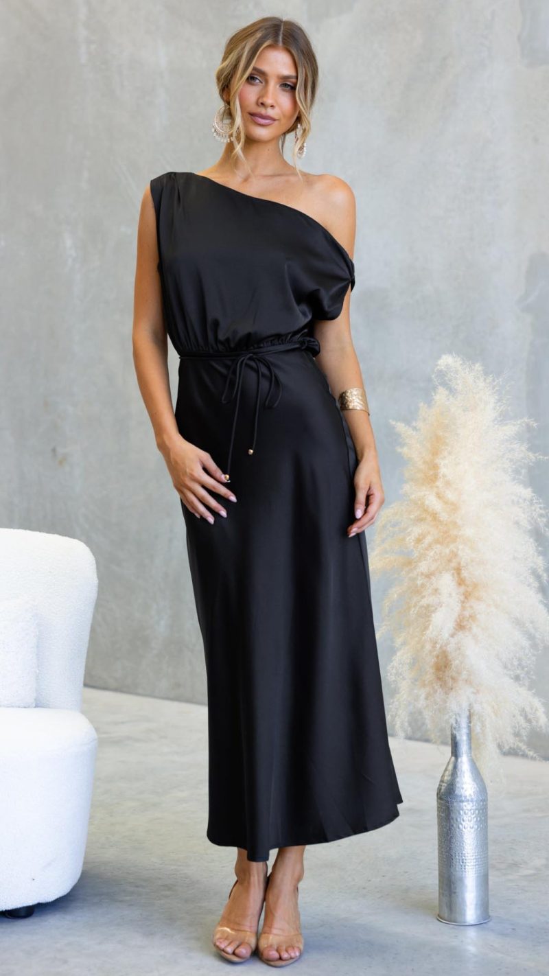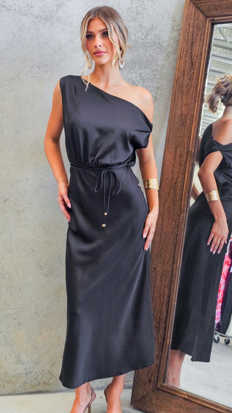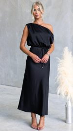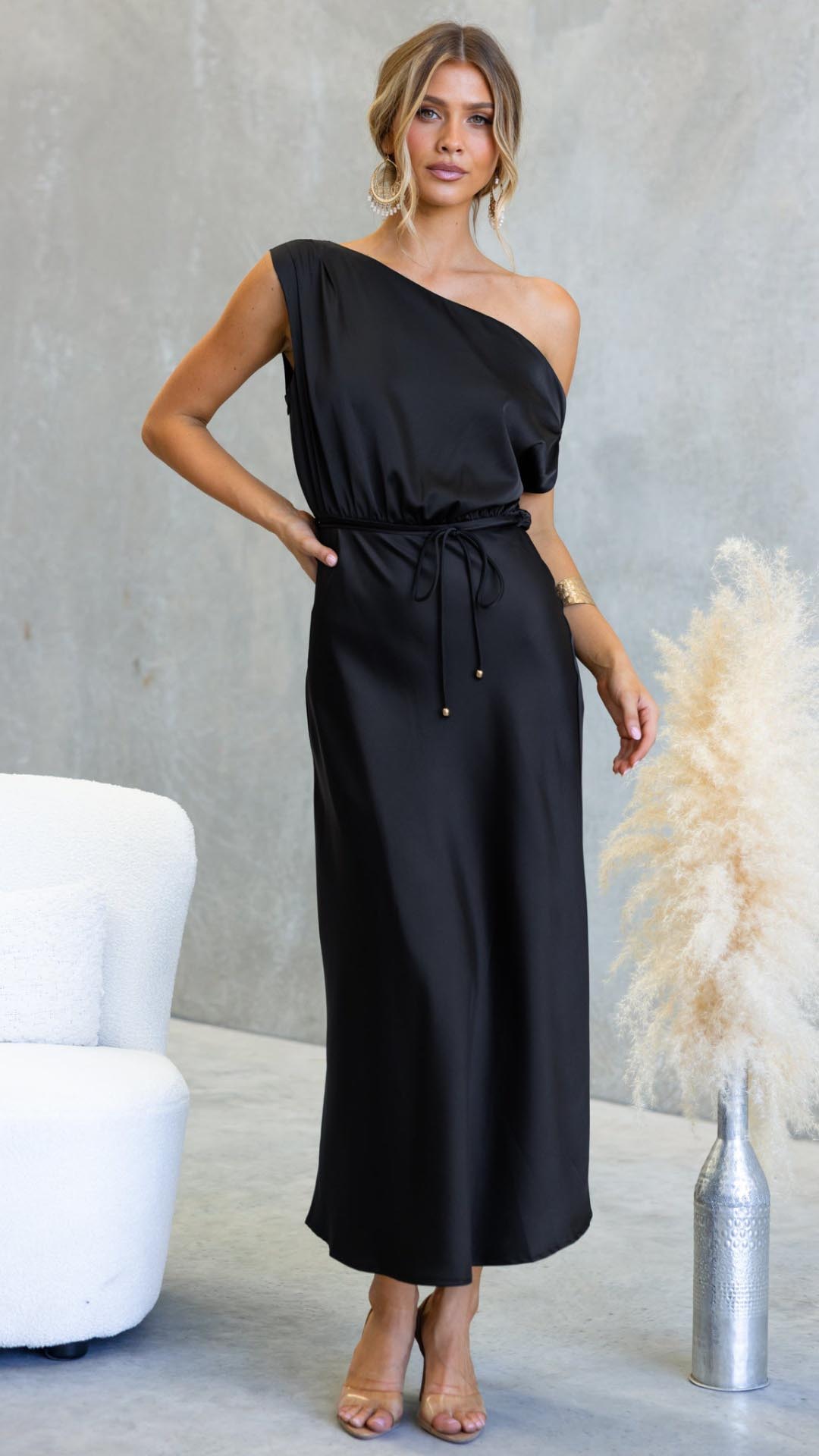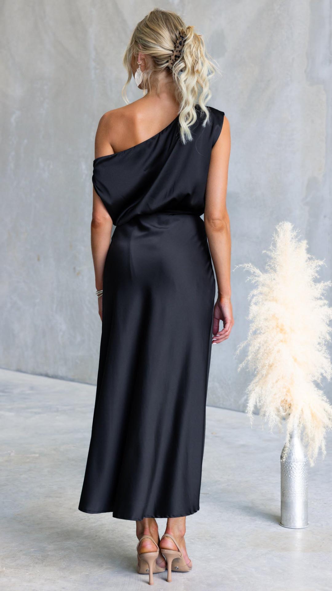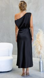 Toperth BLACK Draped Satin One-Shoulder Maxi Dress