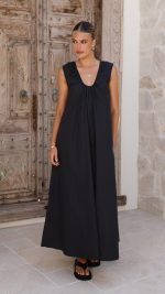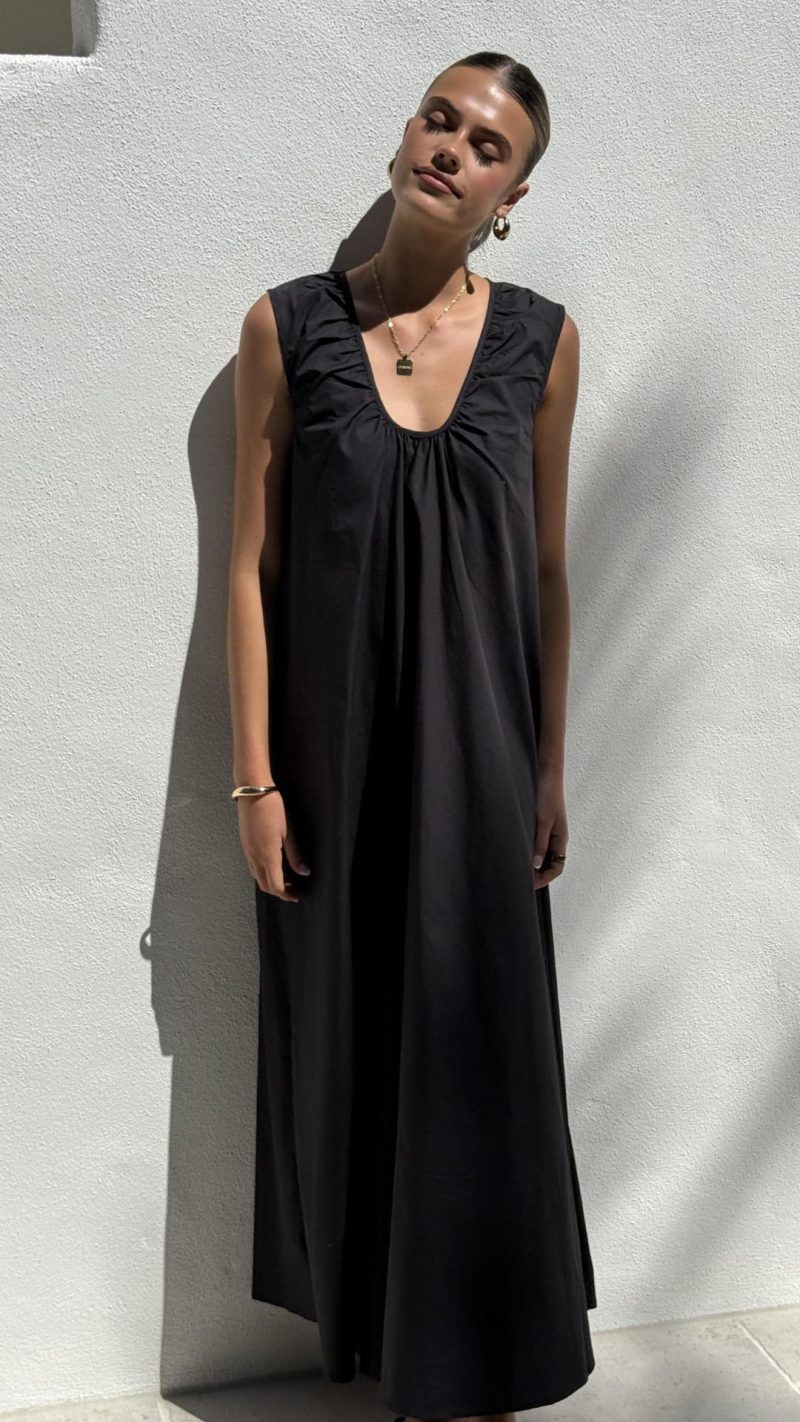 Design Note — Voluminous A-line silhouette suspends from a gathered neckline, crafted in breathable to allow effortless movement. Unlined for immediate cooling, the generous cut floats freely for unconstrained summer ease.
