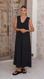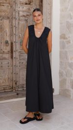 Toperth Black Gathered-Neck A-Line Maxi Dress