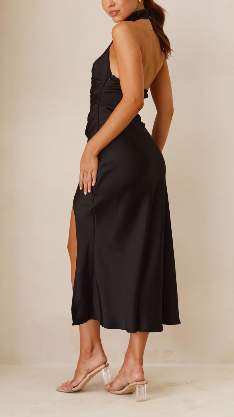 Turn heads in this brown satin maxi dress. Designed with a high neck halter, wrap-style skirt, and gathered front, it flatters your figure effortlessly while offering timeless elegance.