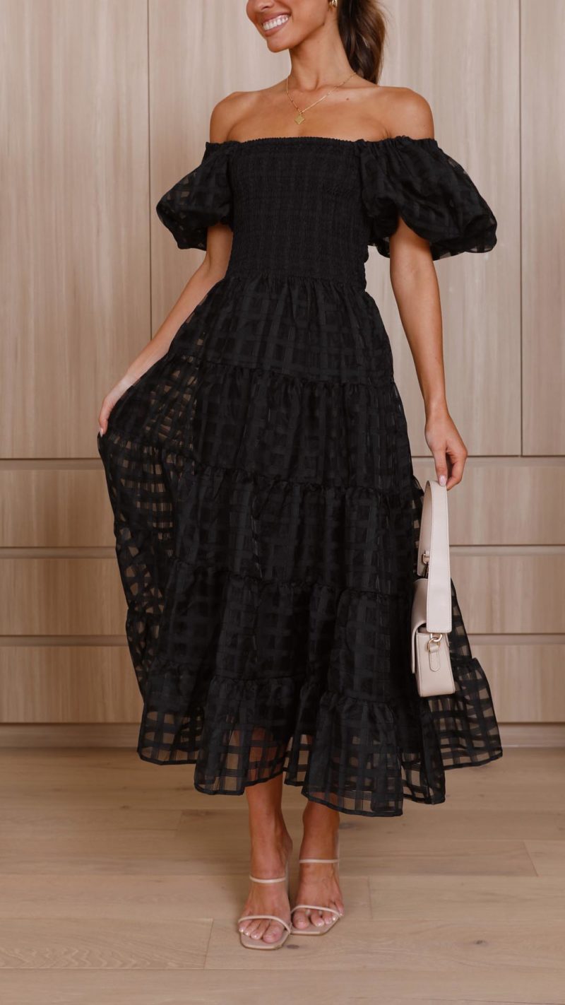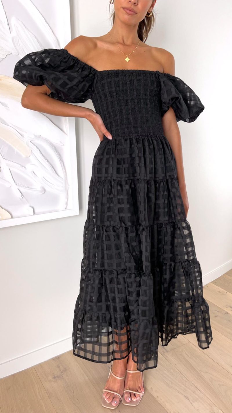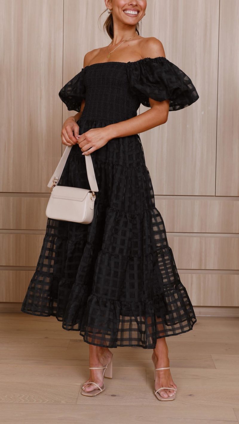 Embrace effortless charm in this off-shoulder maxi dress featuring textured check fabric, statement puff sleeves, and a tiered silhouette. The shirred bodice adds comfort and style, perfect for any occasion.