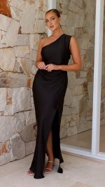 Toperth Black One-Shoulder Gathered Split Maxi Dress