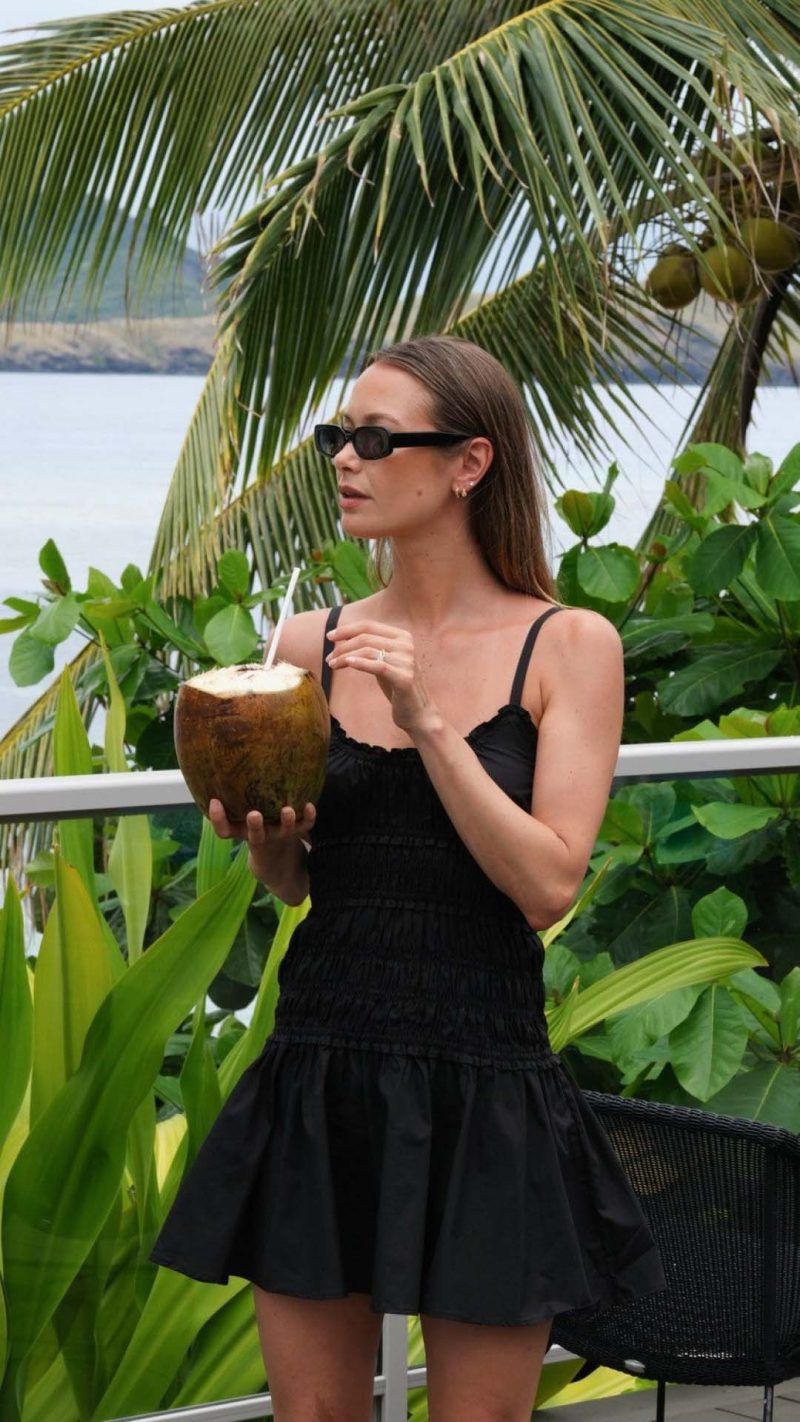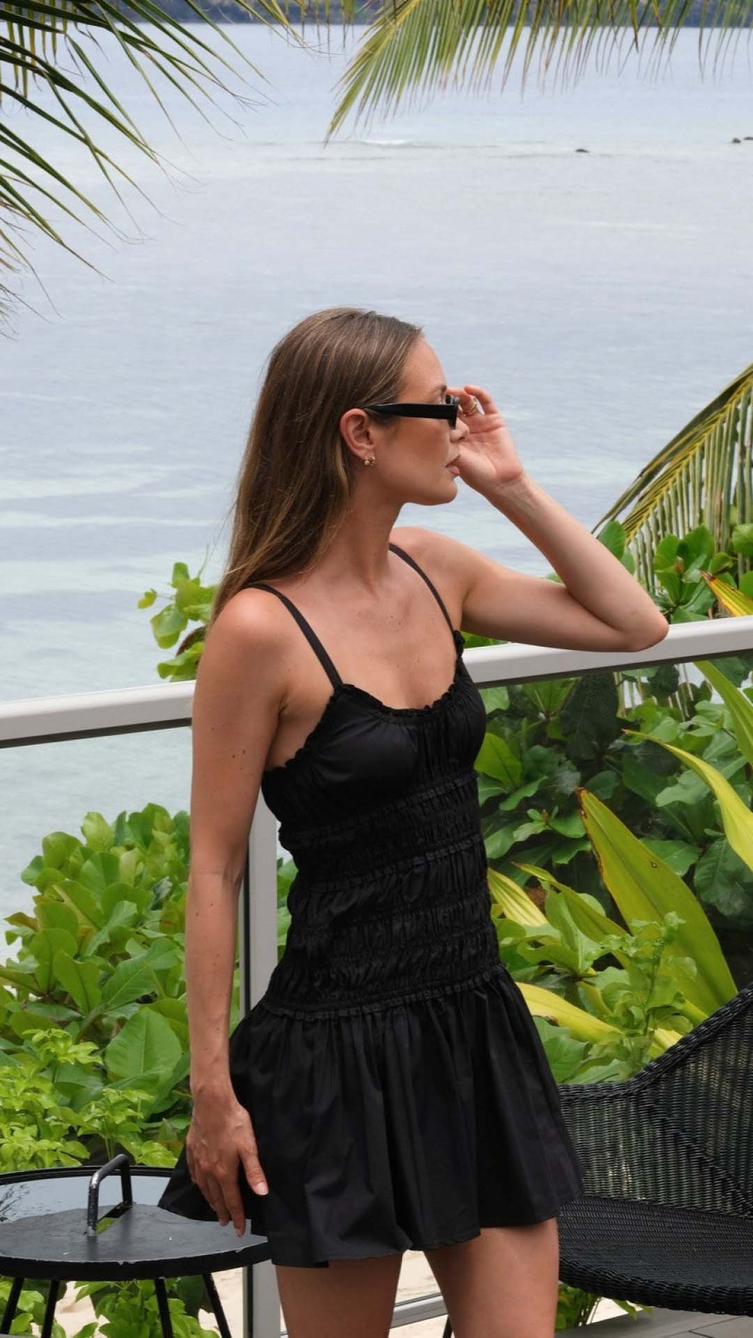 Ruffled scoop neckline detailing frames the collarbones with precise delicacy, establishing a calibrated focal point. Through the torso, a fully shirred bodice adapts dynamically to the body before releasing into a gathered skirt built for kinetic ease.