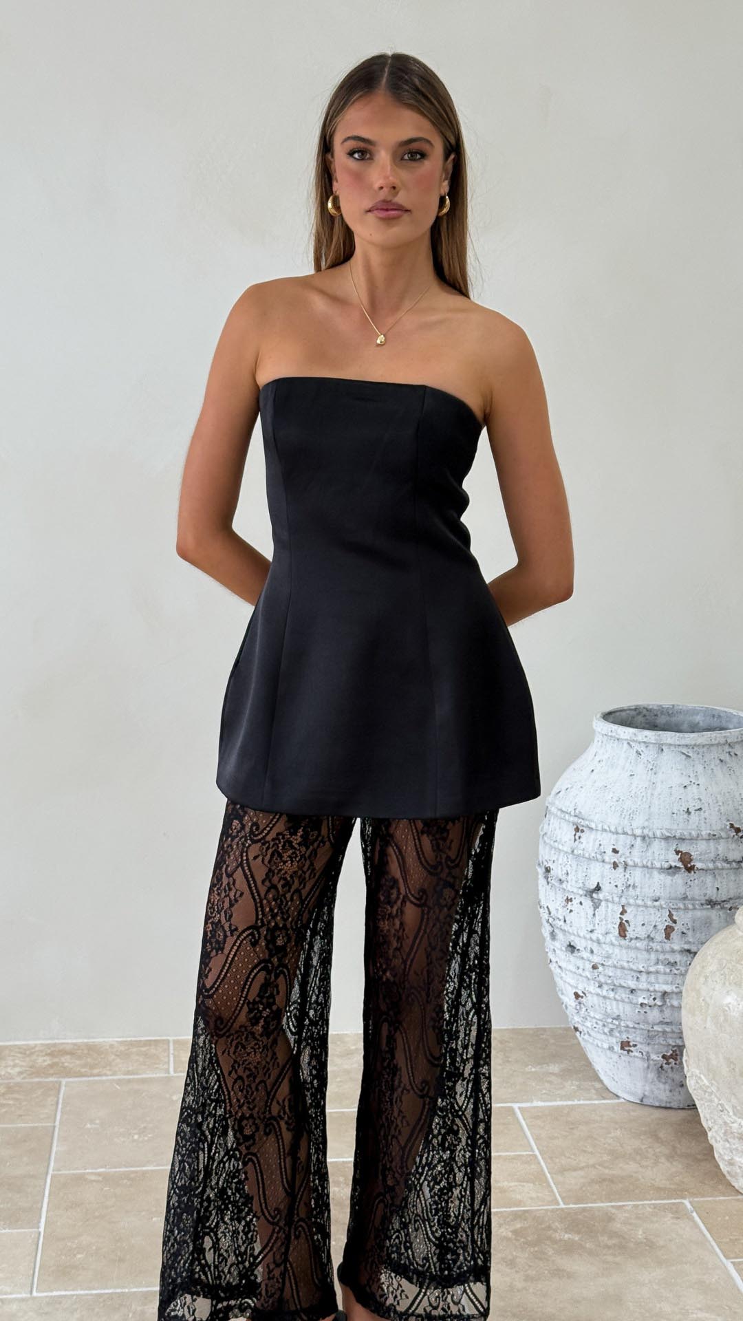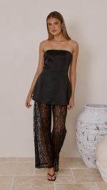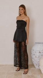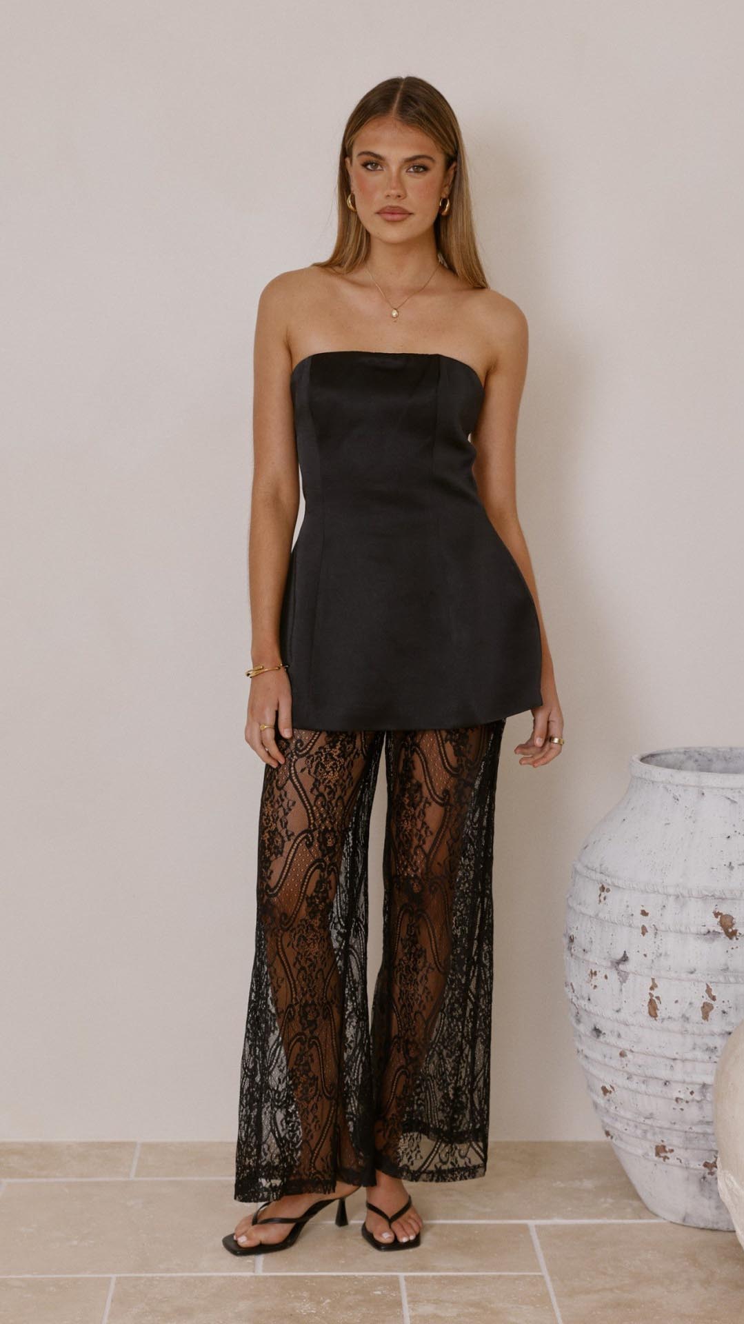 Design Note — This strapless A-line lace set pairs a sleek silicone-grip top with sheer high-waisted pants—perfect for elegant nights with bold, feminine energy.