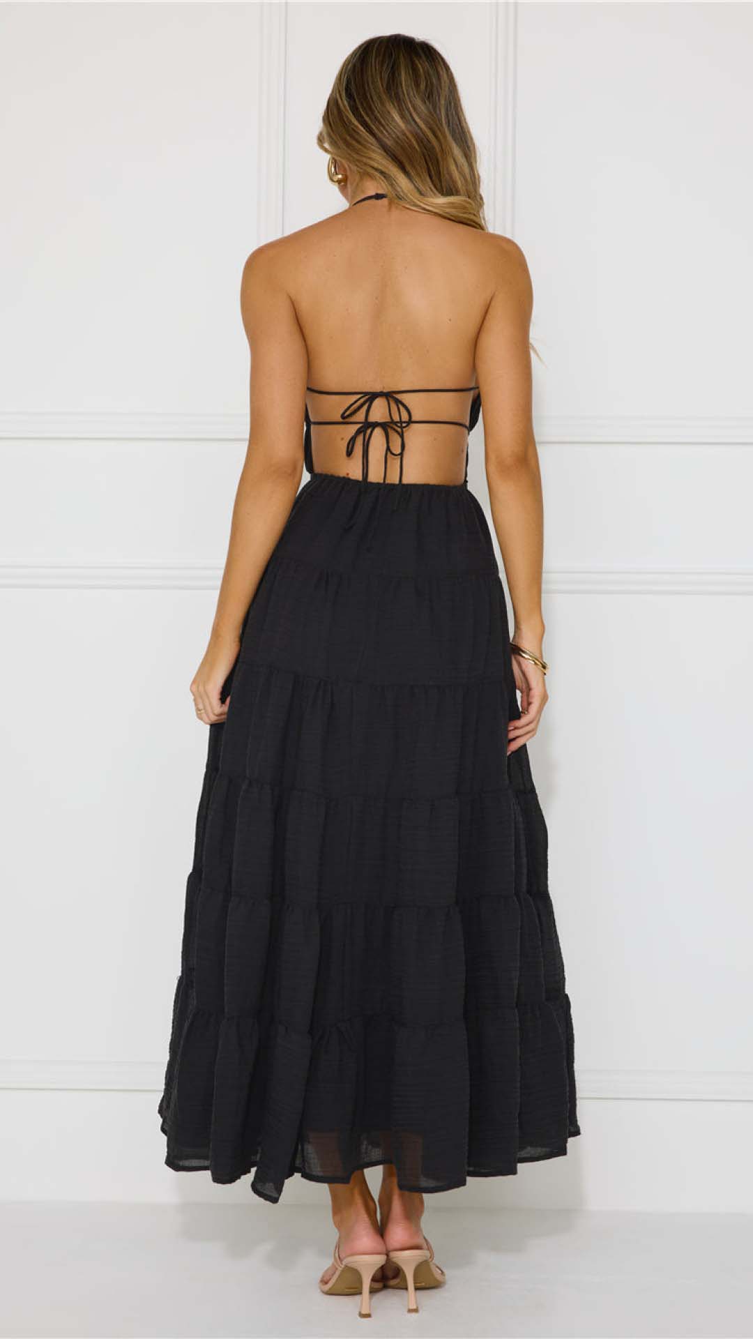 Slender string ties calibrate the open back for exact tension, anchoring a shirred bodice that shapes the torso before releasing into a tiered skirt. The lightweight fabric allows the sweeping hem to catch the air, projecting effortless occasion grace.