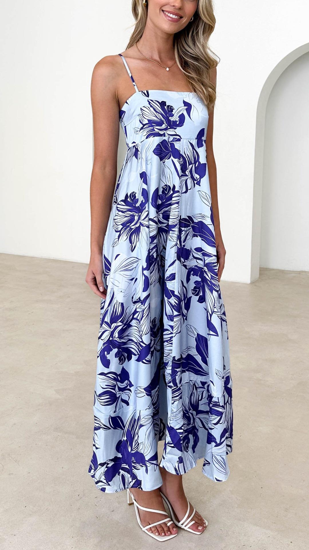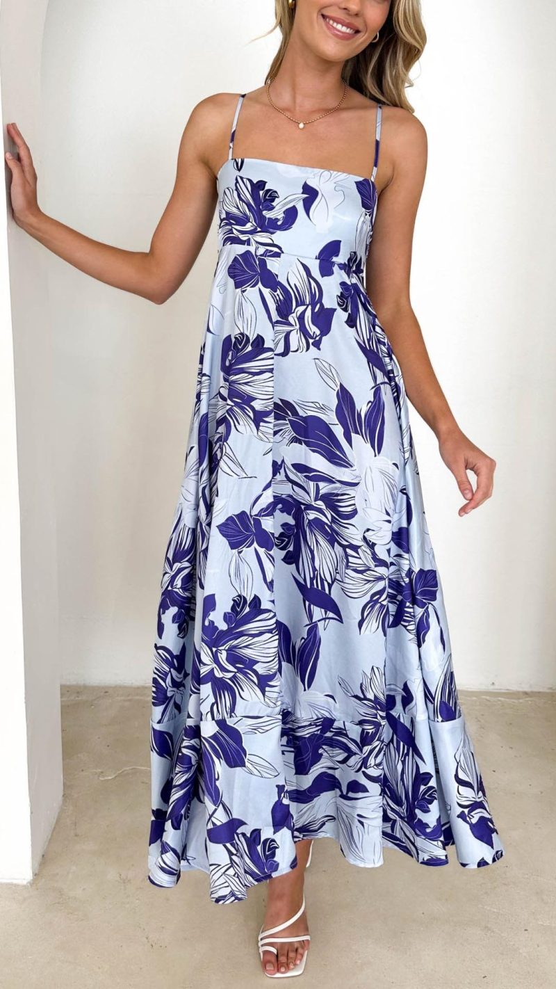 Toperth Blue Floral Print Strappy Maxi Dress