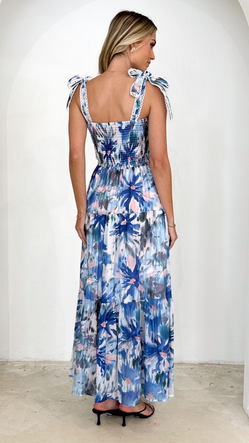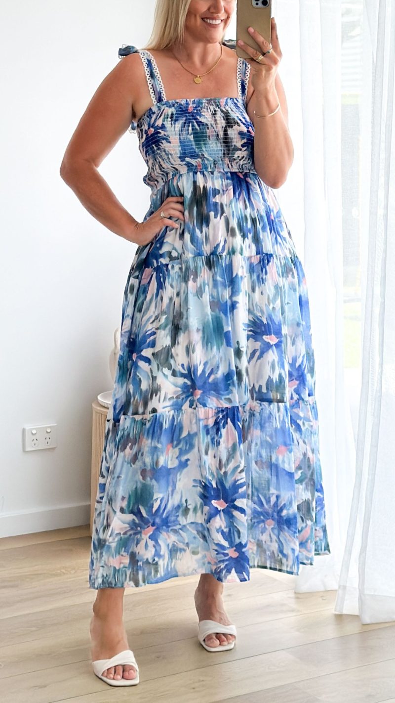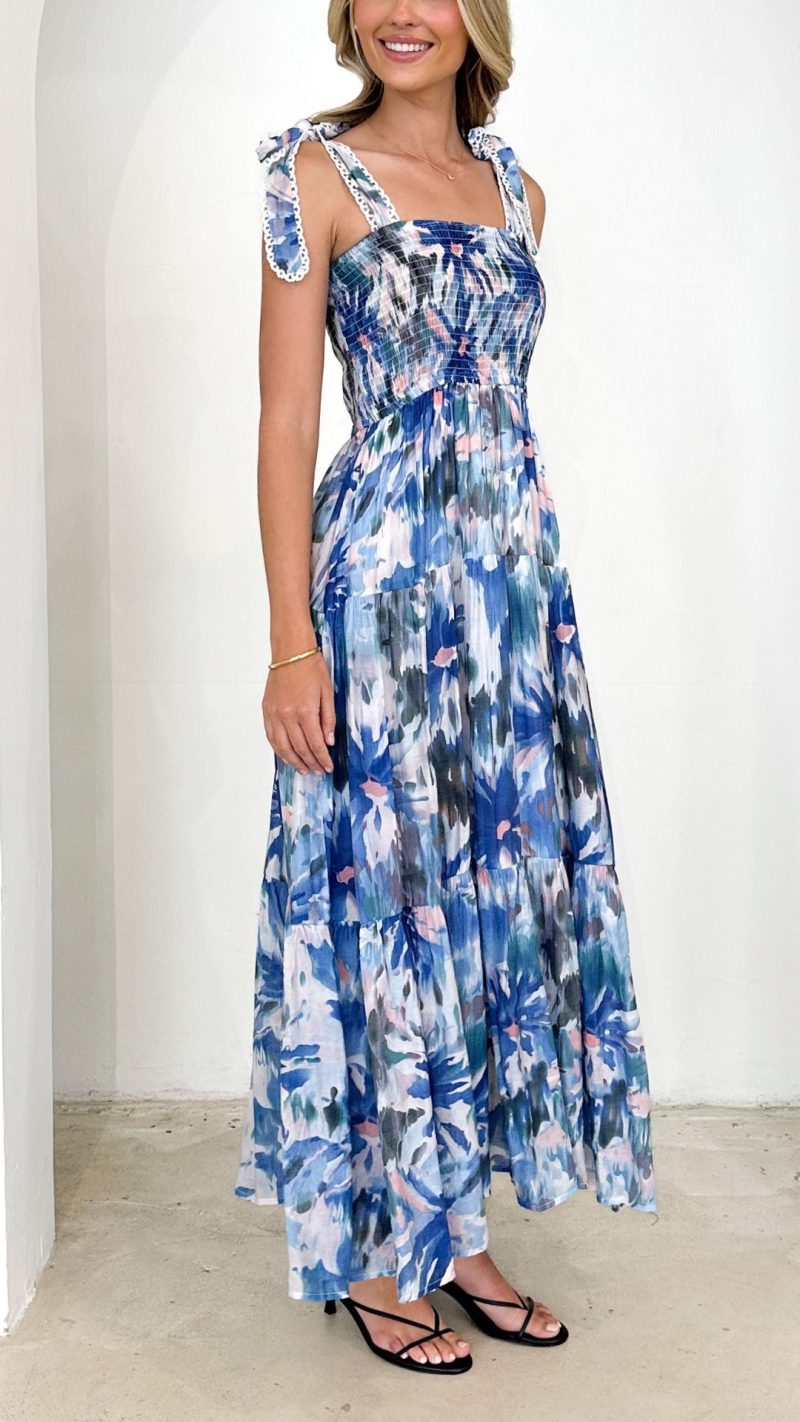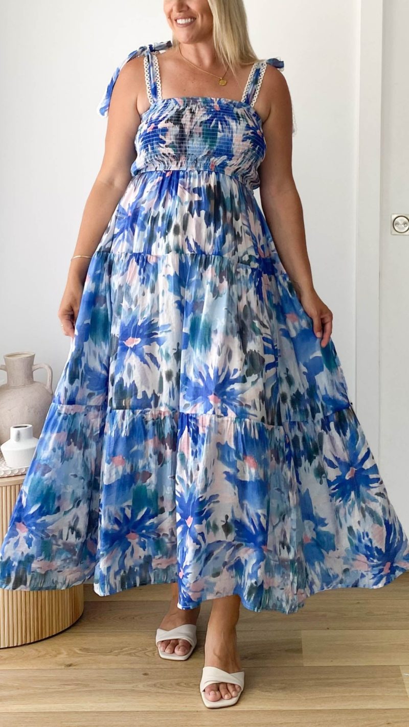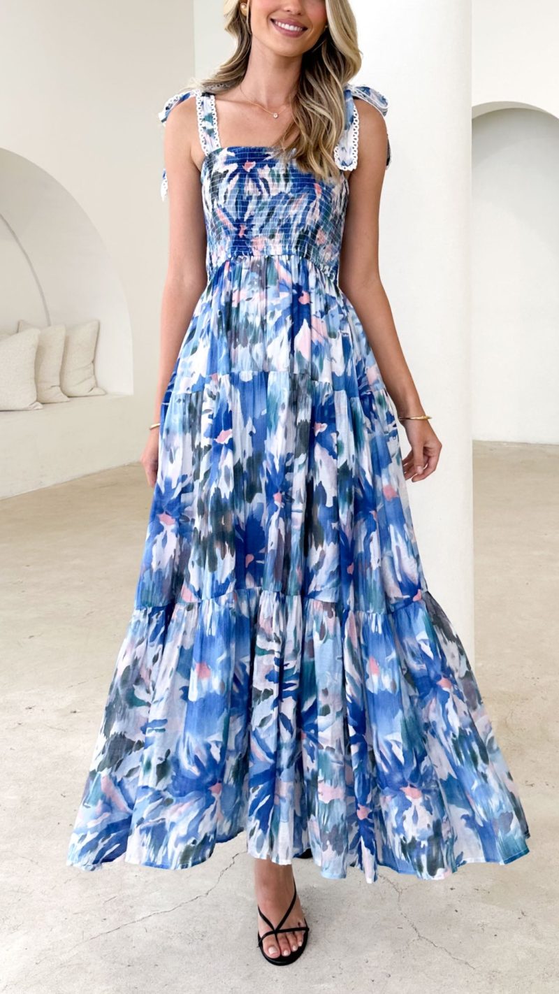Effortlessly feminine, this floral maxi dress features a flattering smocked bodice and delicate tie straps for a customizable fit. The flowy tiered skirt adds a romantic touch, perfect for brunches, garden parties, or summer getaways. Pair with strappy sandals and gold accessories for an elevated look.