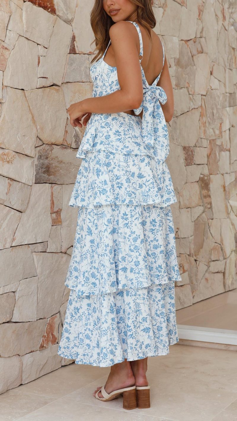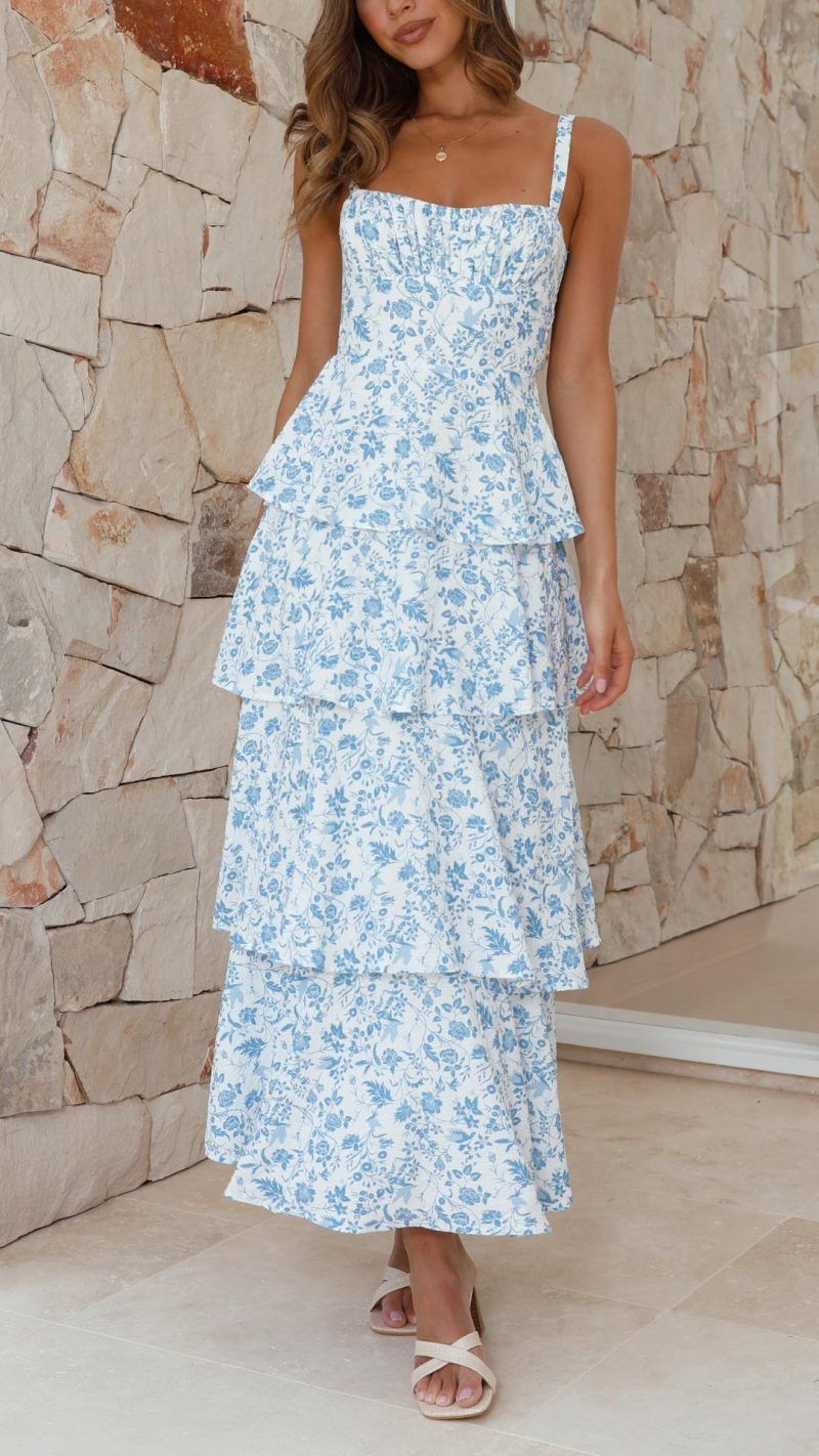 Absolutely stunning! The blue floral print is so delicate and feminine, and the layered ruffles make it feel extra special. Perfect for summer weddings or brunch dates!