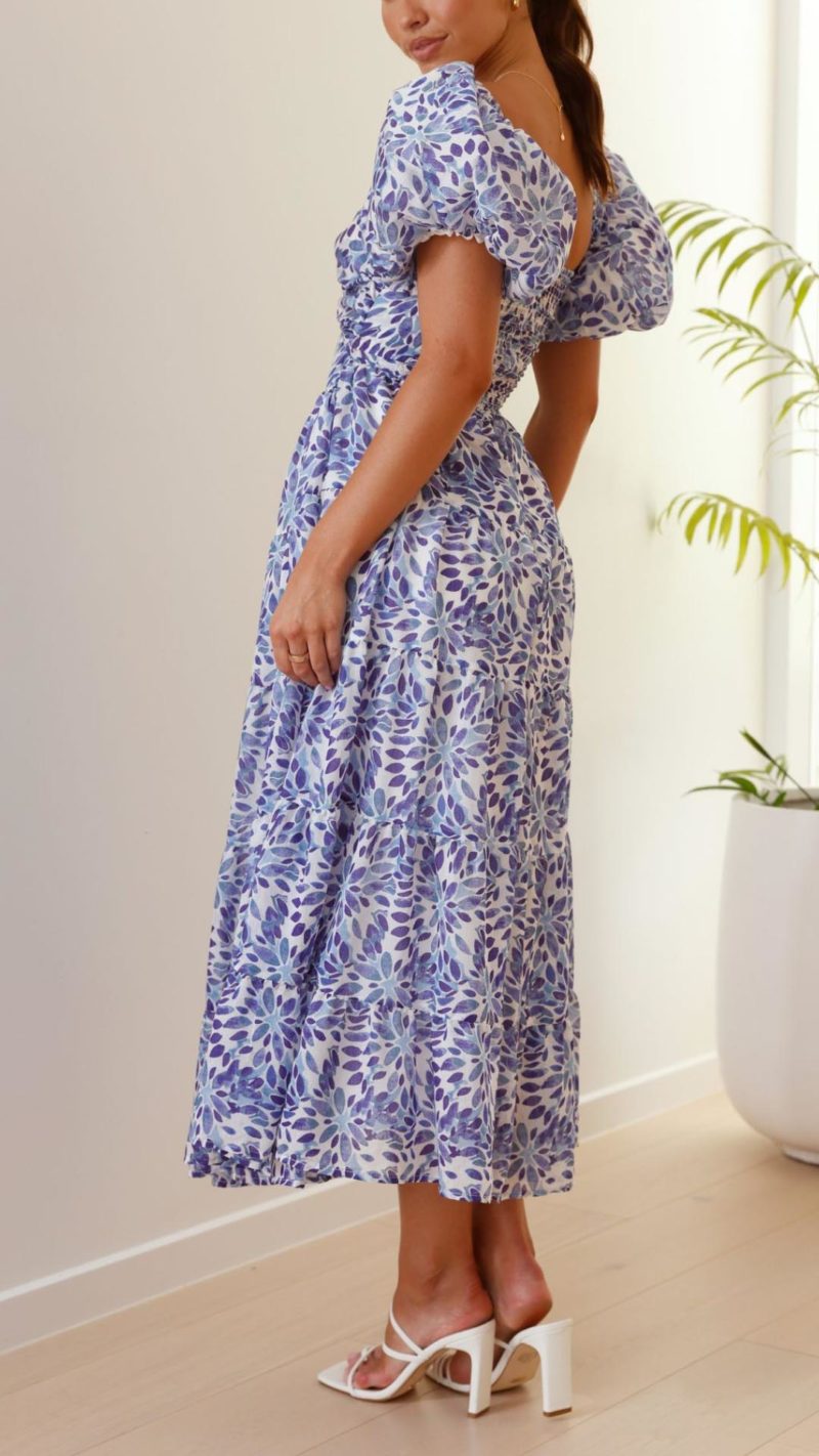 Charm and elegance bloom in this Blue Leafy Puff Sleeve Maxi Dress. Designed with an off-shoulder option, it features a twist front and delicate tiered skirt for a graceful flow. Perfect for any sunny day occasion.