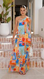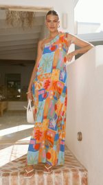 Design Note — Defined by a vibrant blue and orange abstract print, this one-shoulder maxi flows in breathable rayon secured by an adjustable tie. Hidden side pockets maintain clean lines, merging utility with effortless movement.