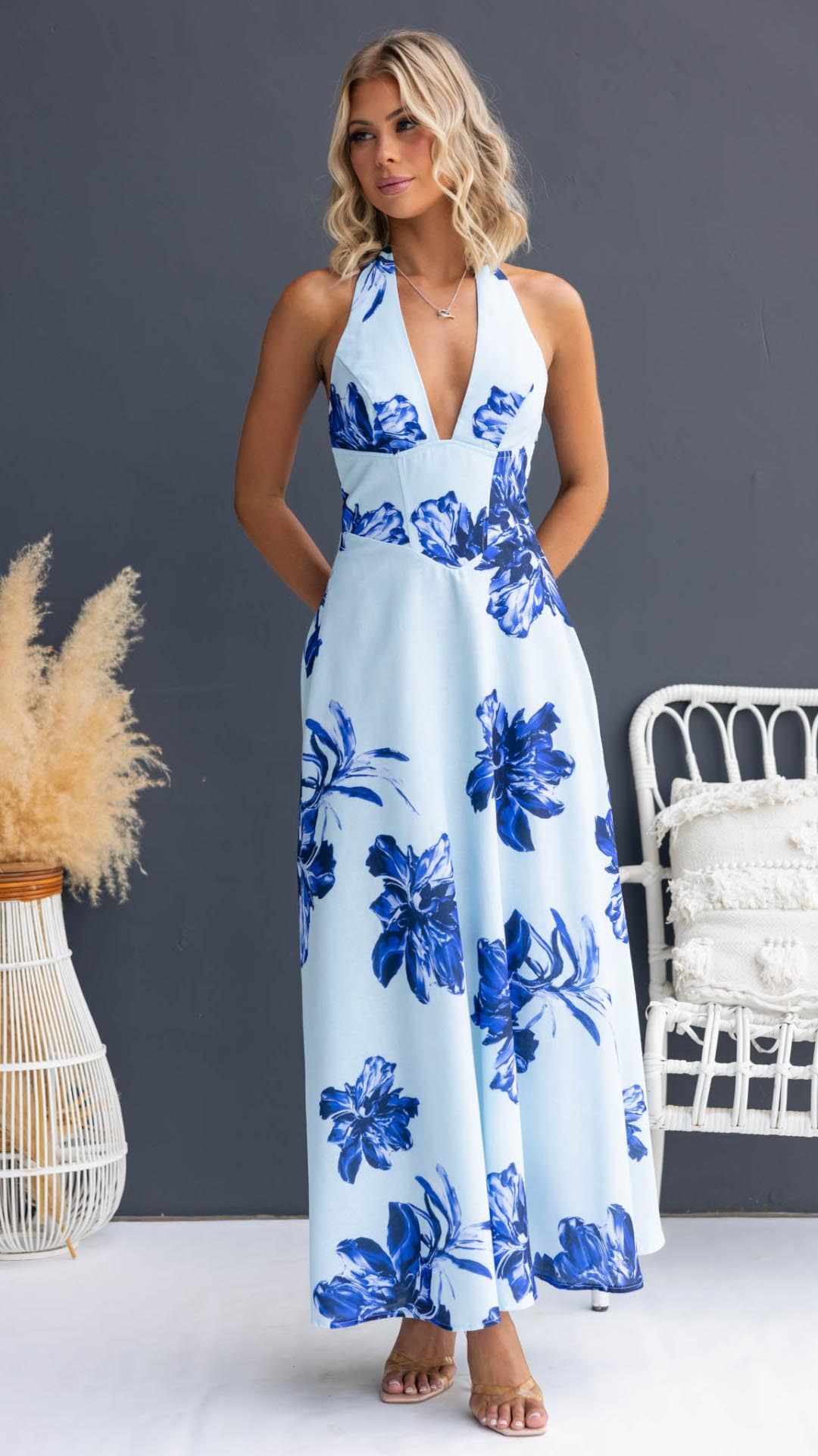 Plunging halter straps frame the décolletage with precise tension, balancing striking exposure with effortless security. Slip-free fit beneath the large-scale floral print.