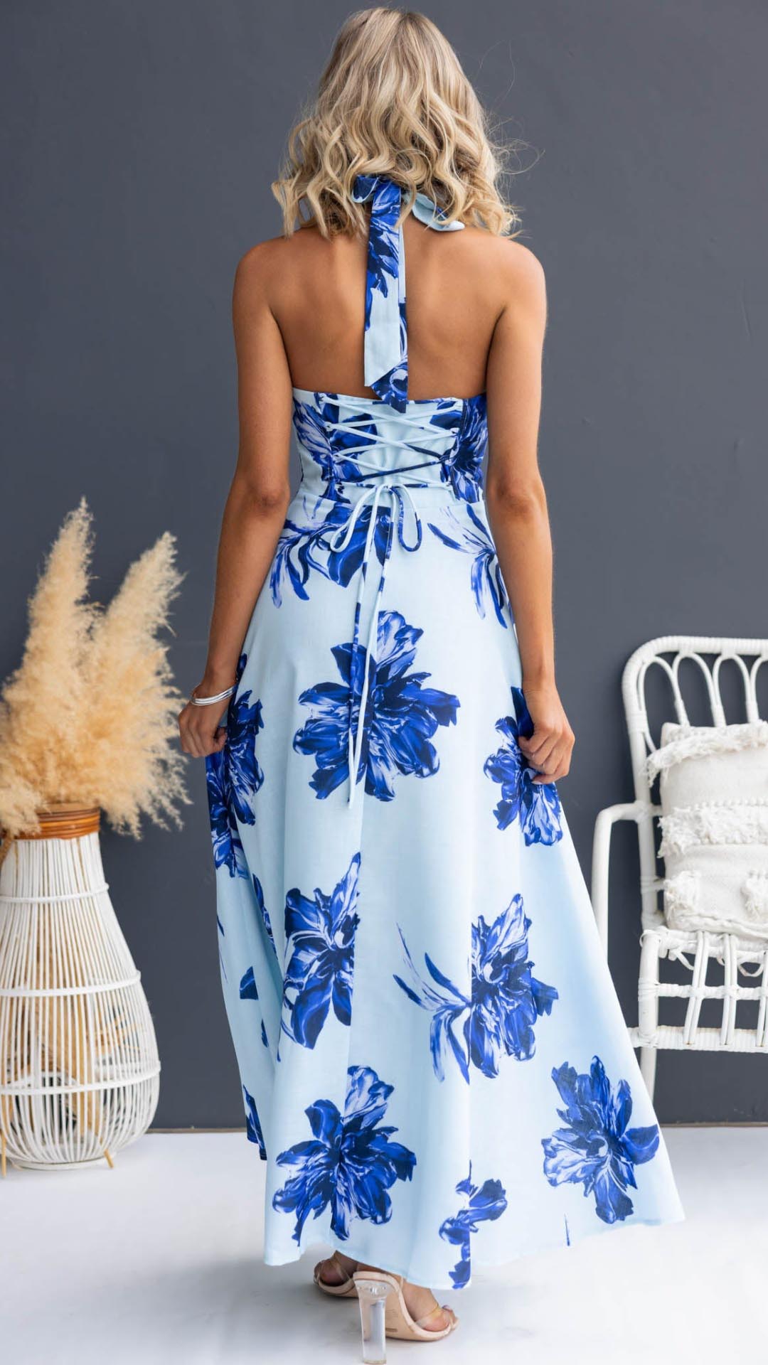 Toperth Blue Plunging Halter Lace-Up Floral Maxi Dress
