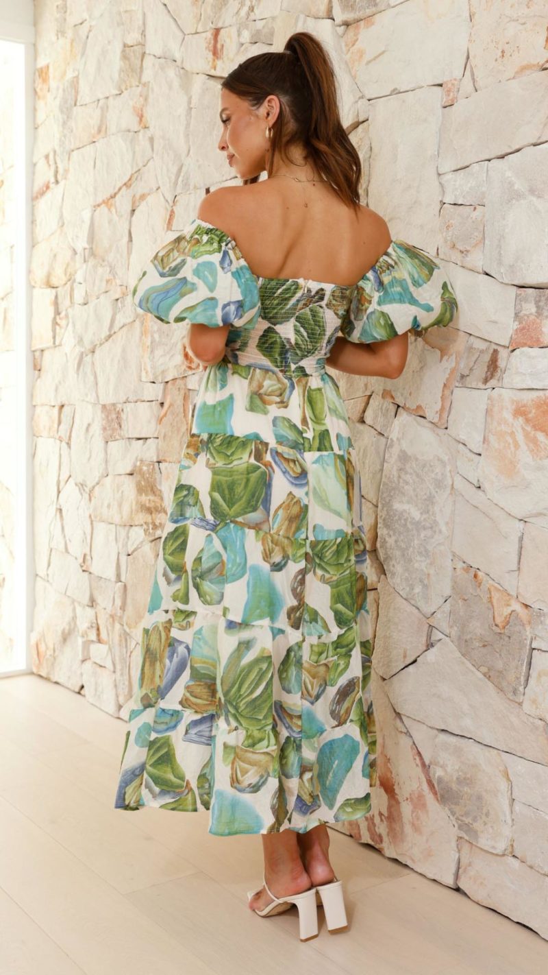 Charm and elegance bloom in this Botanical Puff Sleeve Maxi Dress. Designed with an off-shoulder option, it features a twist front and delicate tiered skirt for a graceful flow. Perfect for any sunny day occasion.