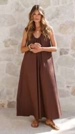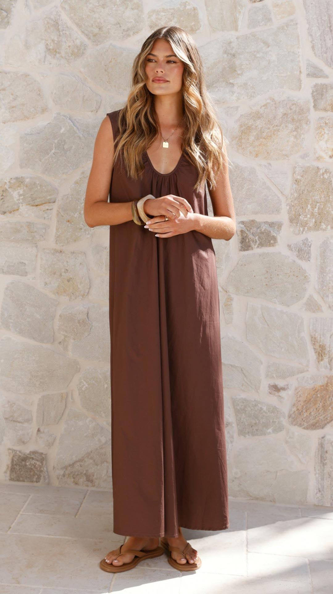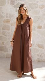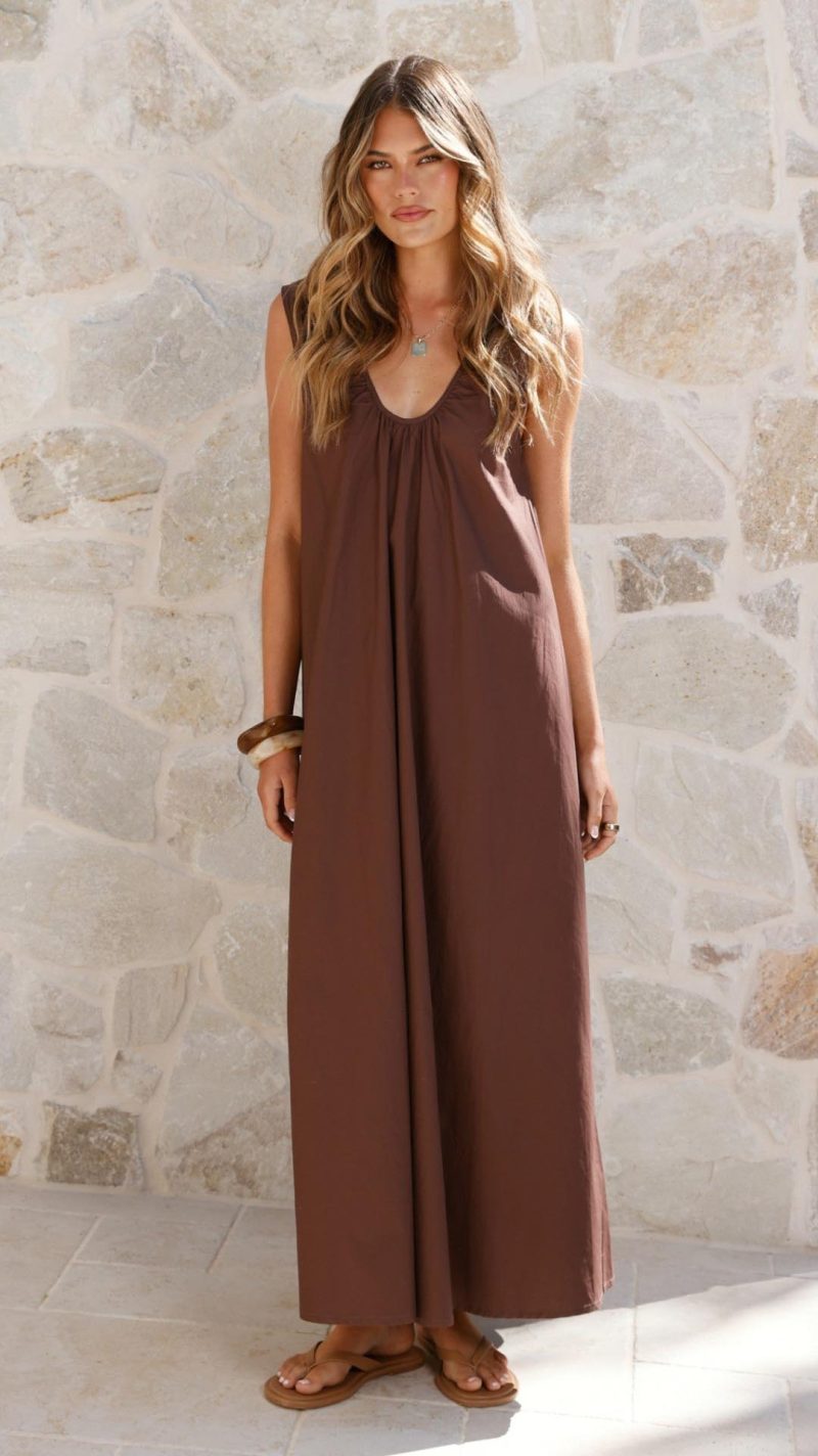 Toperth Brown Gathered-Neck A-Line Maxi Dress