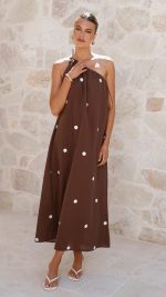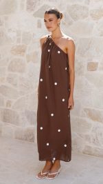 Toperth Brown Polka Dot One-Shoulder Maxi Dress