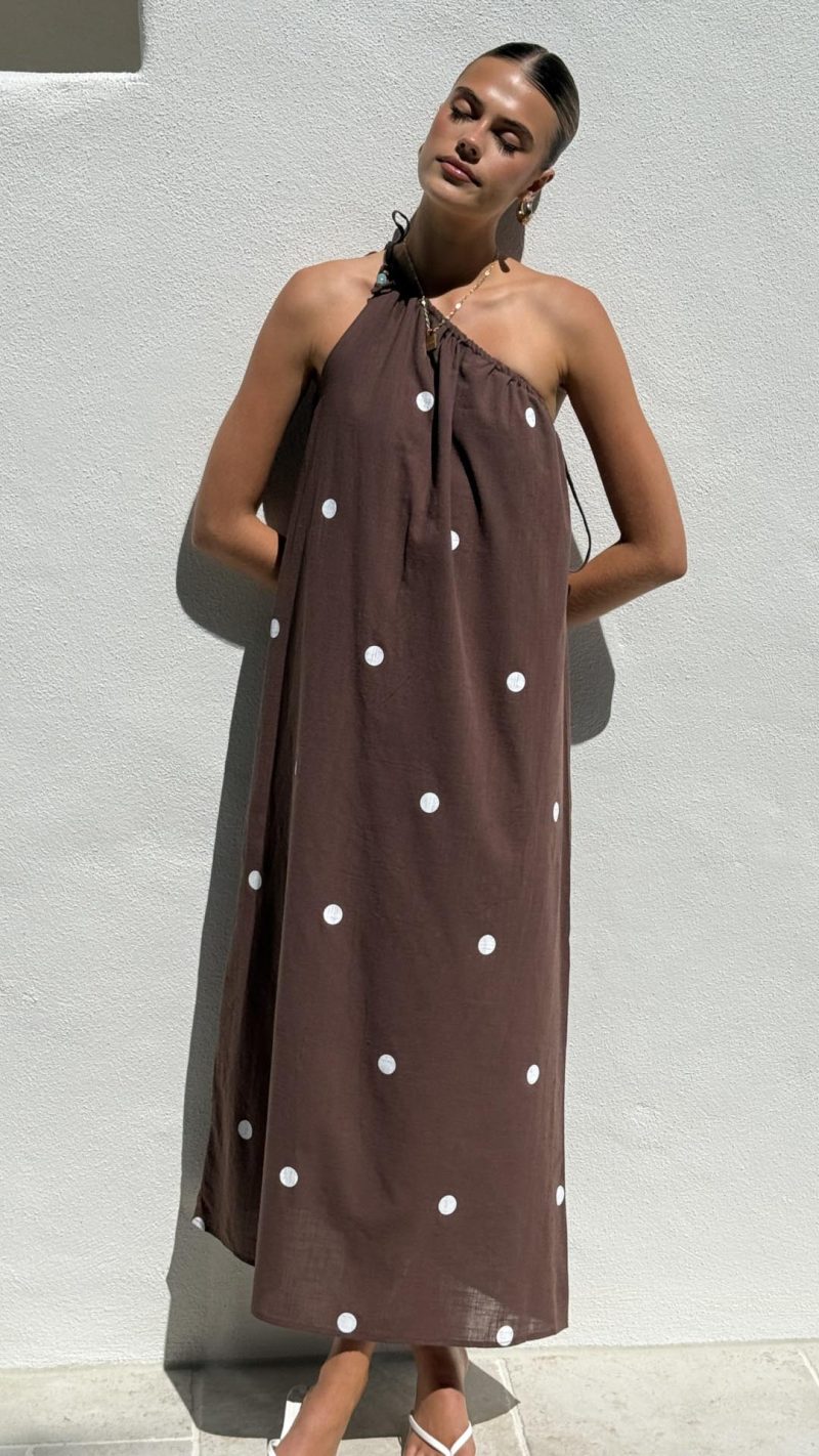 Design Note — Designed with a soft drape and bold one-shoulder shape, this polka dot maxi dress features beaded adjustable ties and lightweight comfort for effortless elegance.