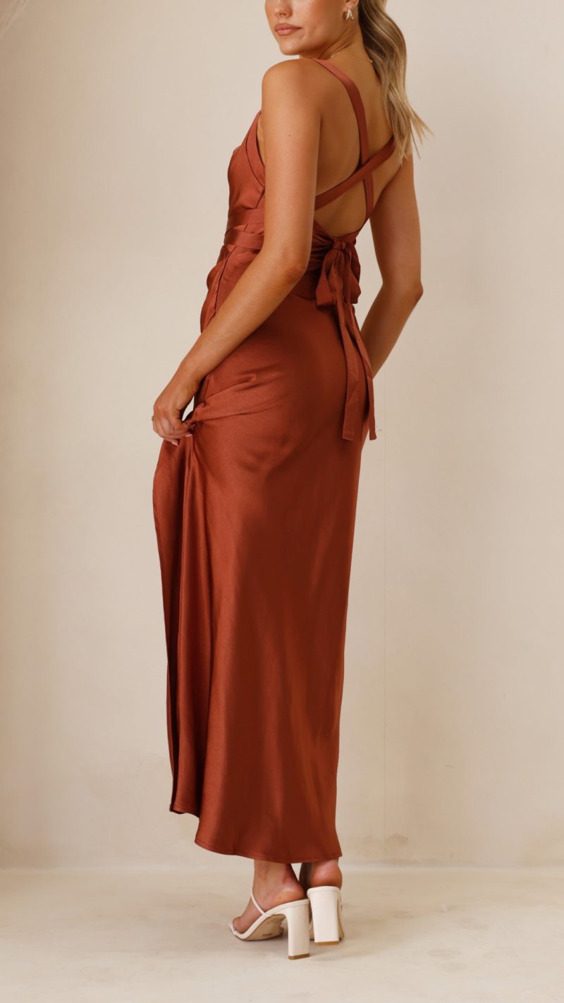 Make a statement in the Satin Tie-Back Maxi Dress, featuring a chic cowl neckline, a daring side split, and adjustable straps that can be tied two ways for a custom fit. Perfect for any elegant occasion.