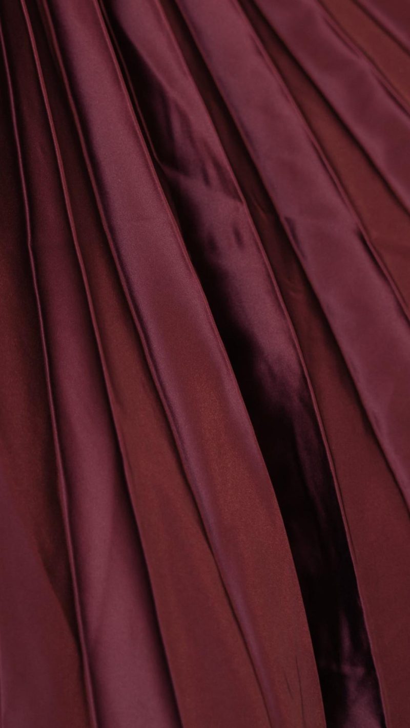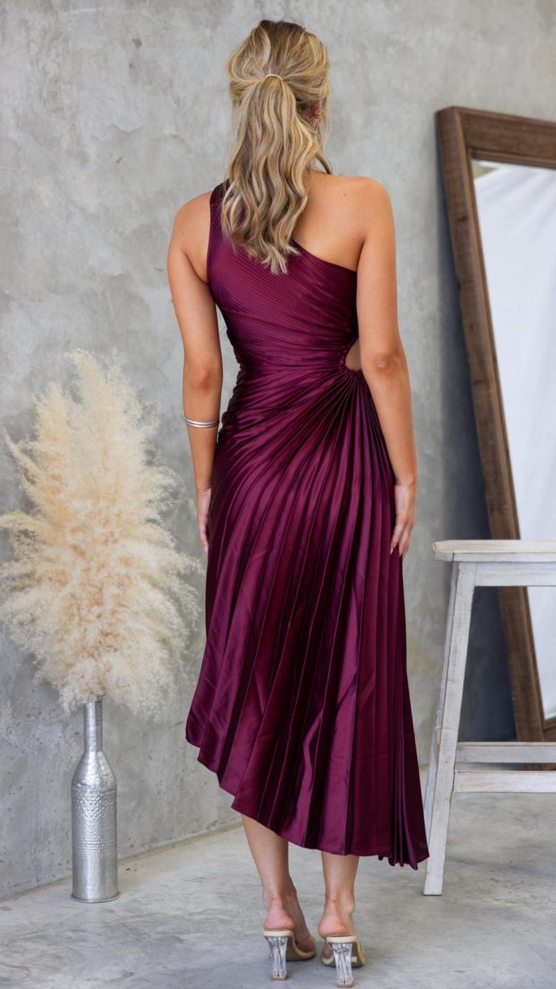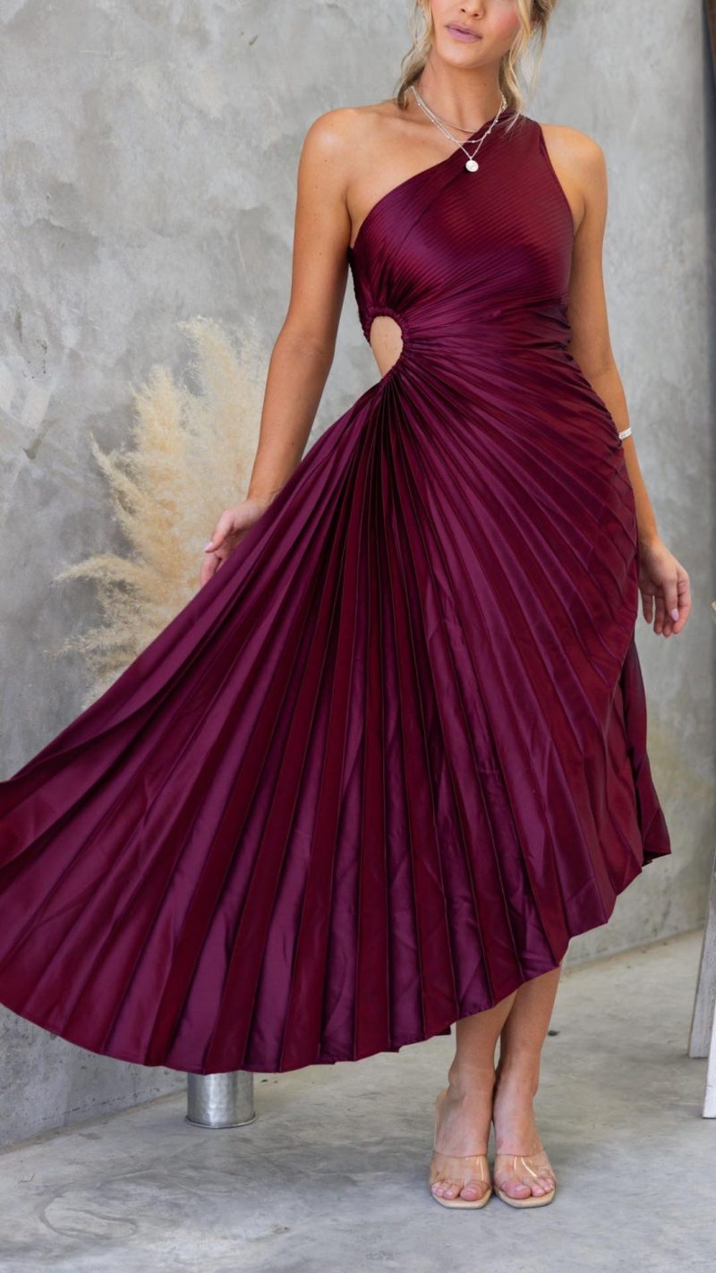 This burgundy maxi dress features a chic one-shoulder neckline, an elegant pleated design, and a stylish waist cut-out for a flattering fit. The accordion pleats add movement, while the invisible side zip ensures a seamless silhouette.