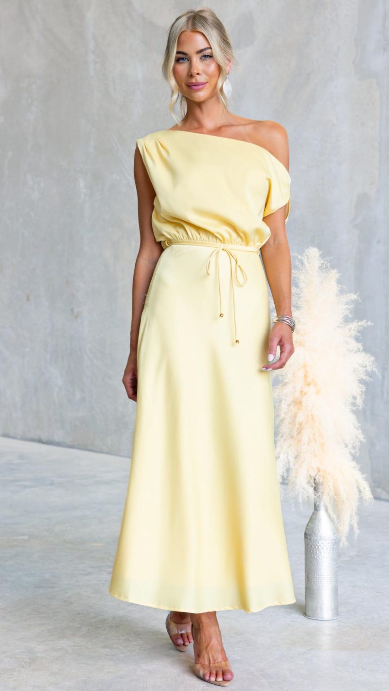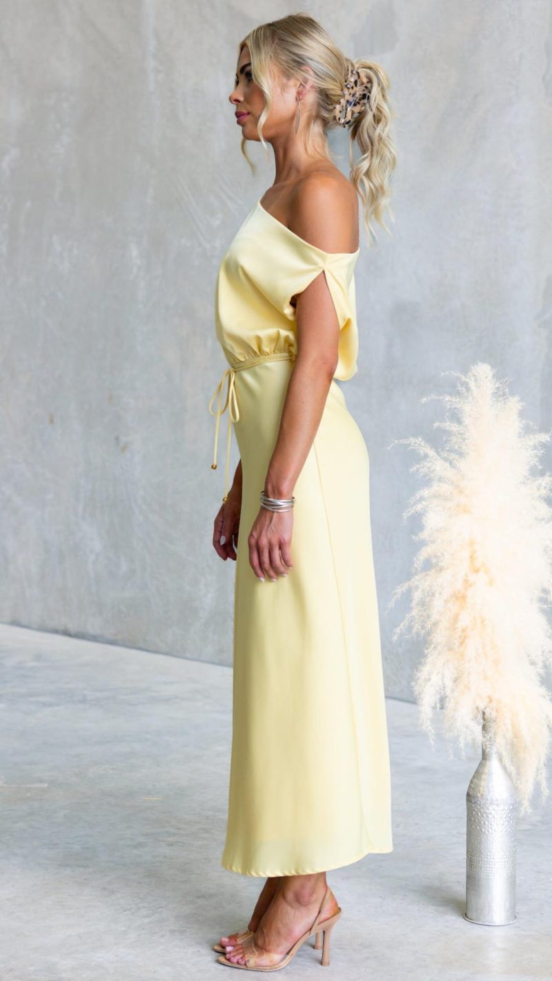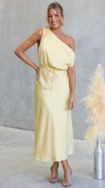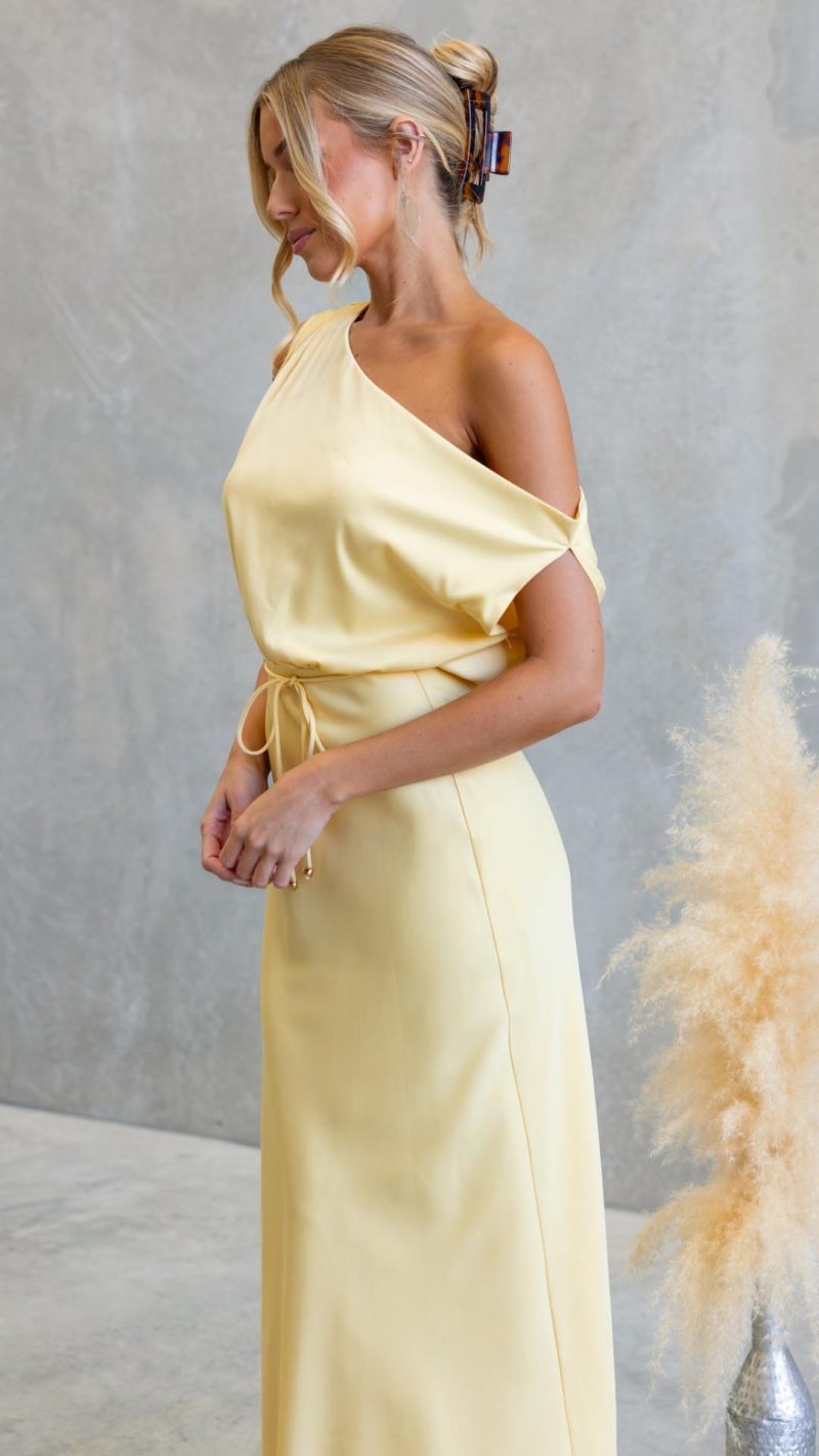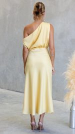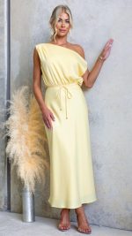 Toperth Butter Yellow Draped Satin One-Shoulder Maxi Dress