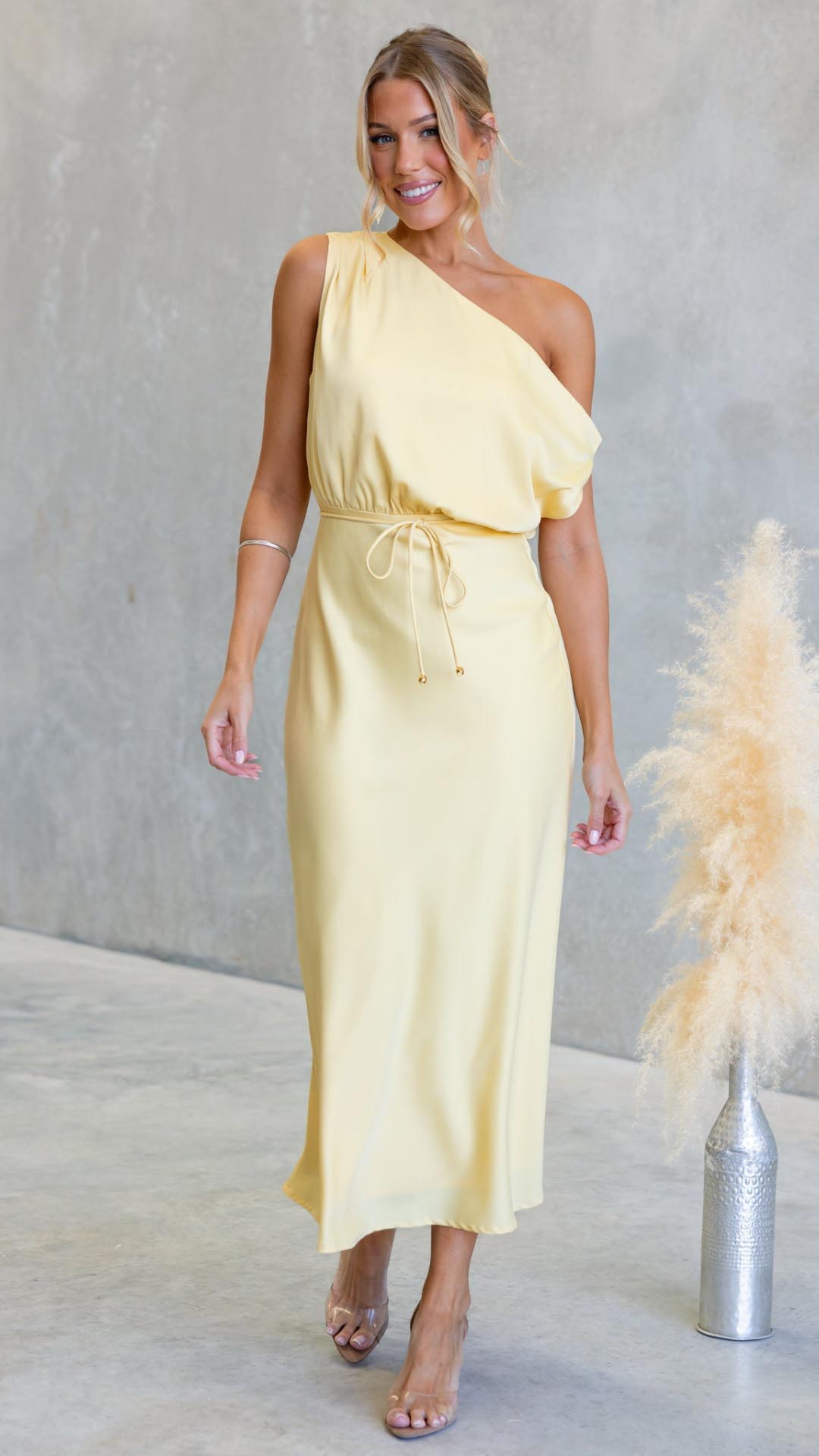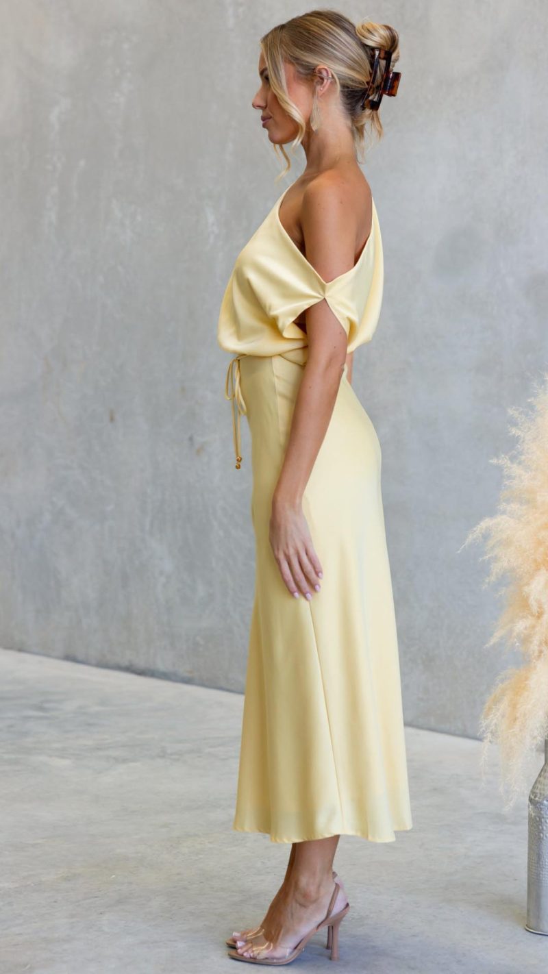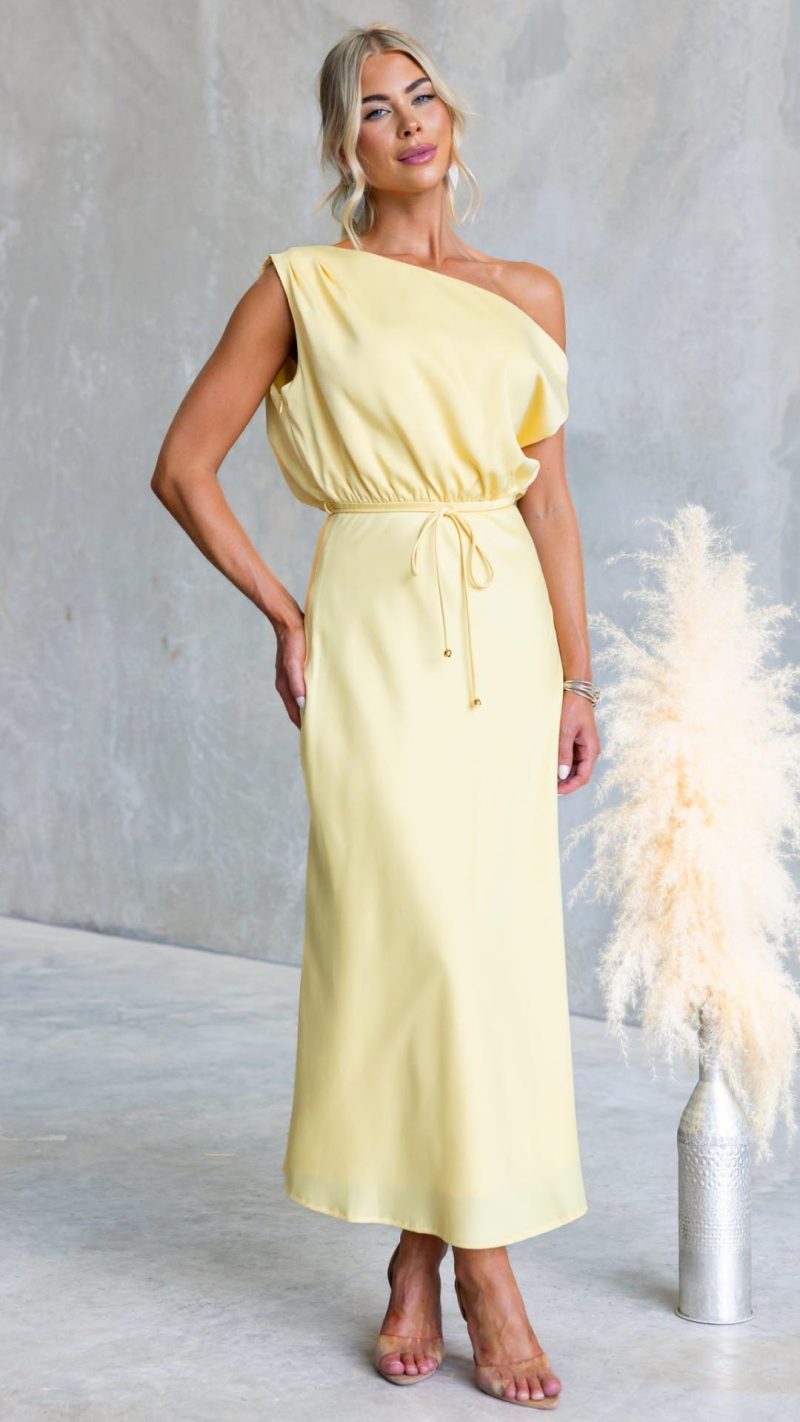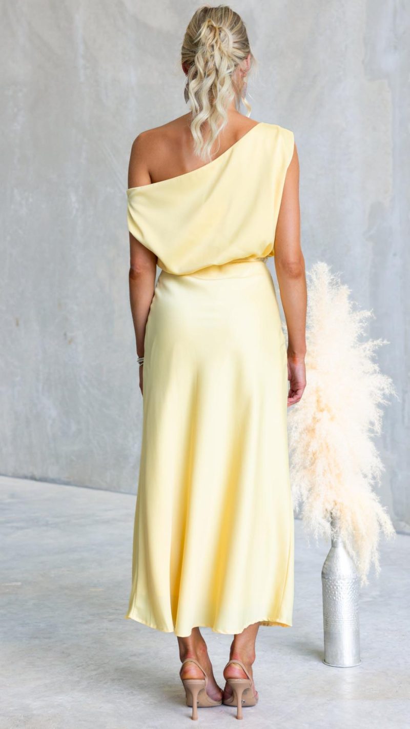Toperth Butter Yellow Draped Satin One-Shoulder Maxi Dress