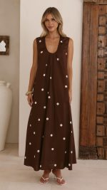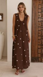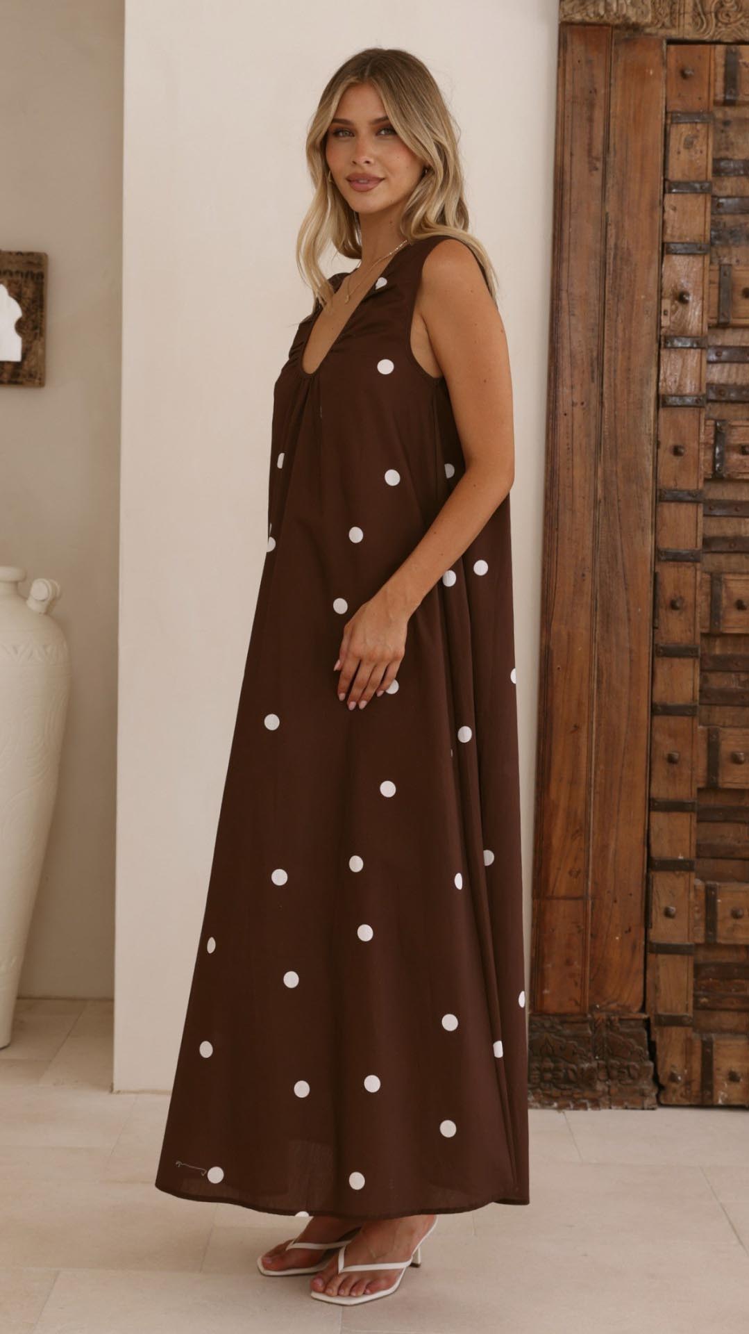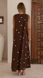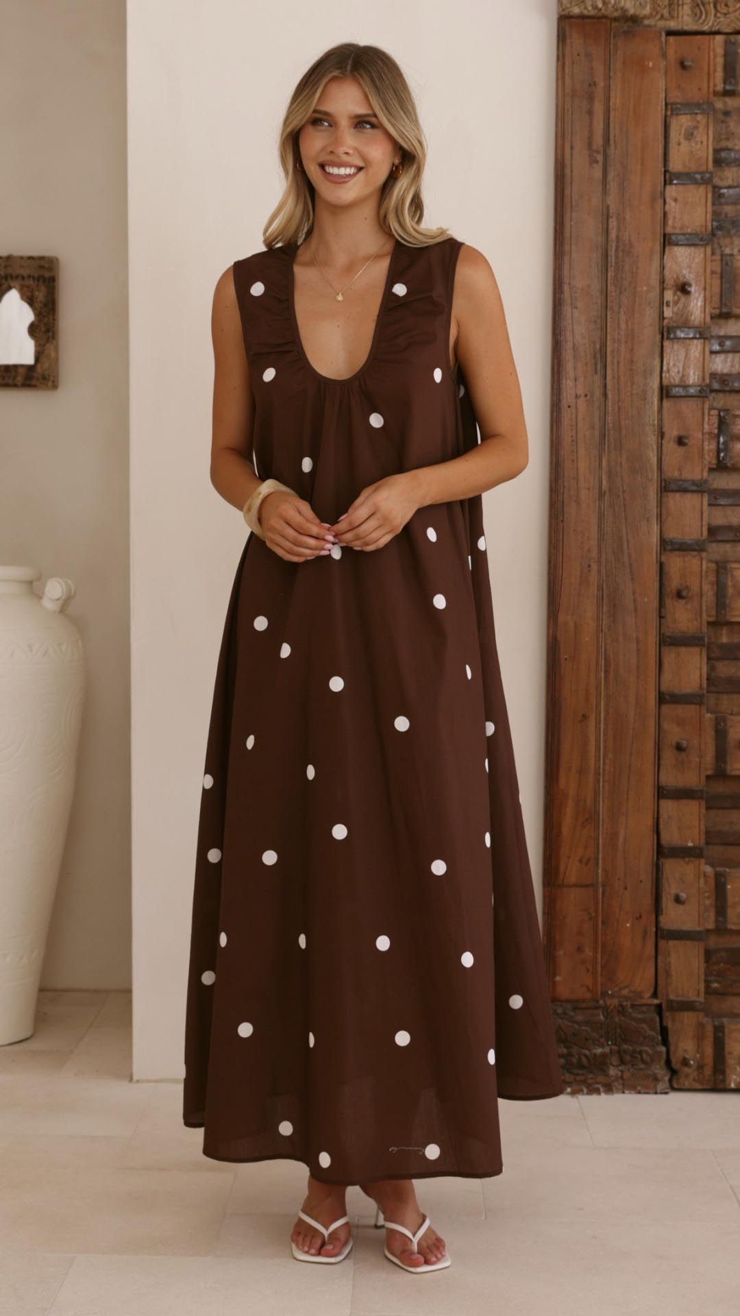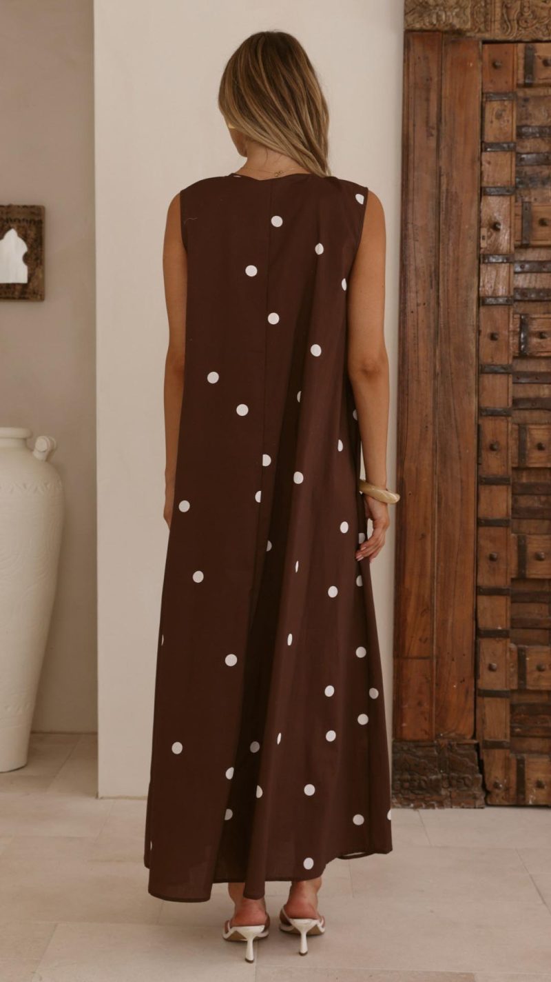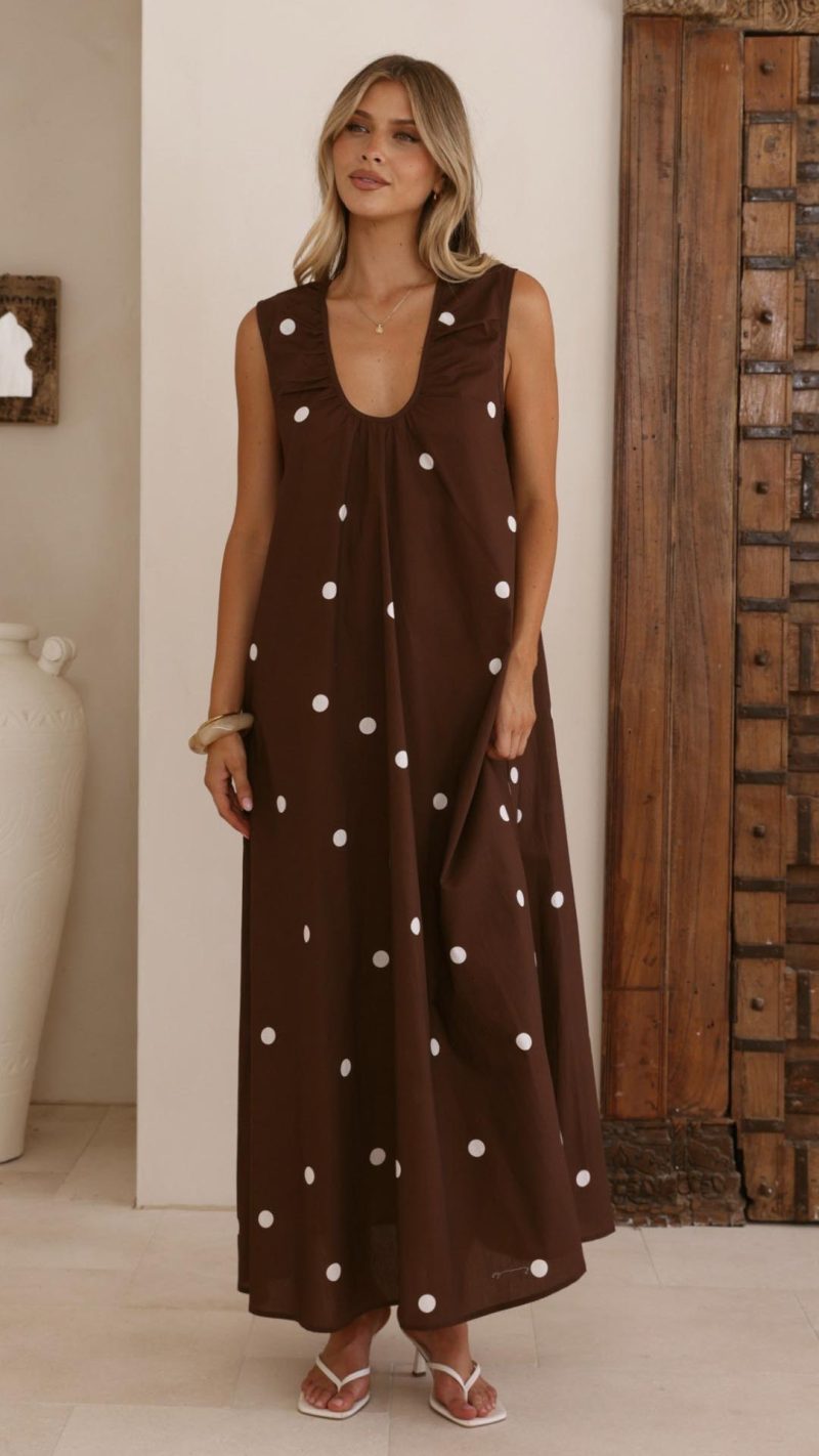 Toperth Chocolate Polka Dot Gathered A-Line Maxi Dress