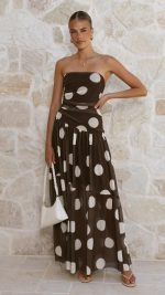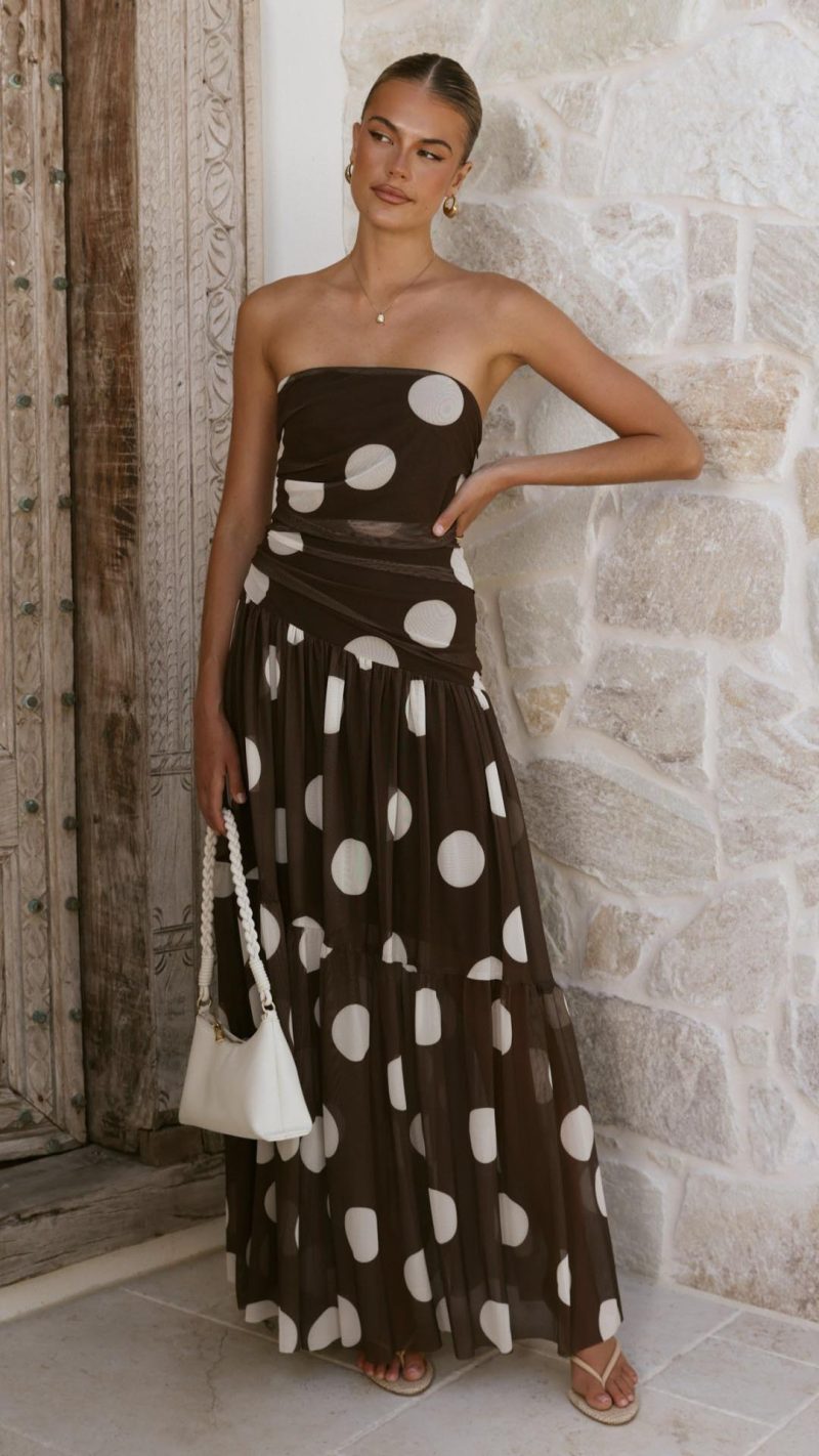 Design Note — A sheer overlay adds kinetic depth to the chocolate spot print, anchored by for secure stability. The gathered bodice transitions into a tiered skirt, balancing structured definition with a fluid, lightweight release.
