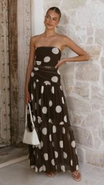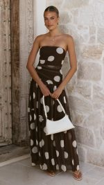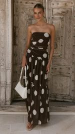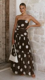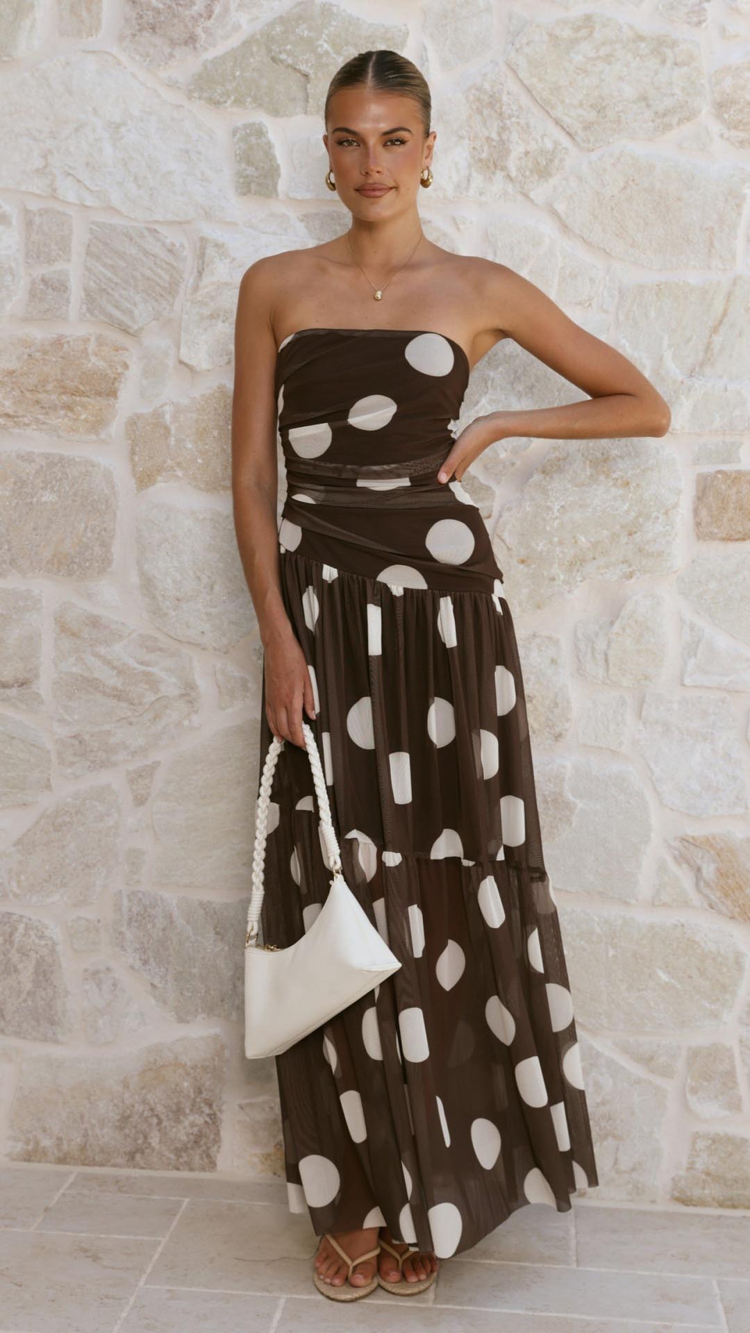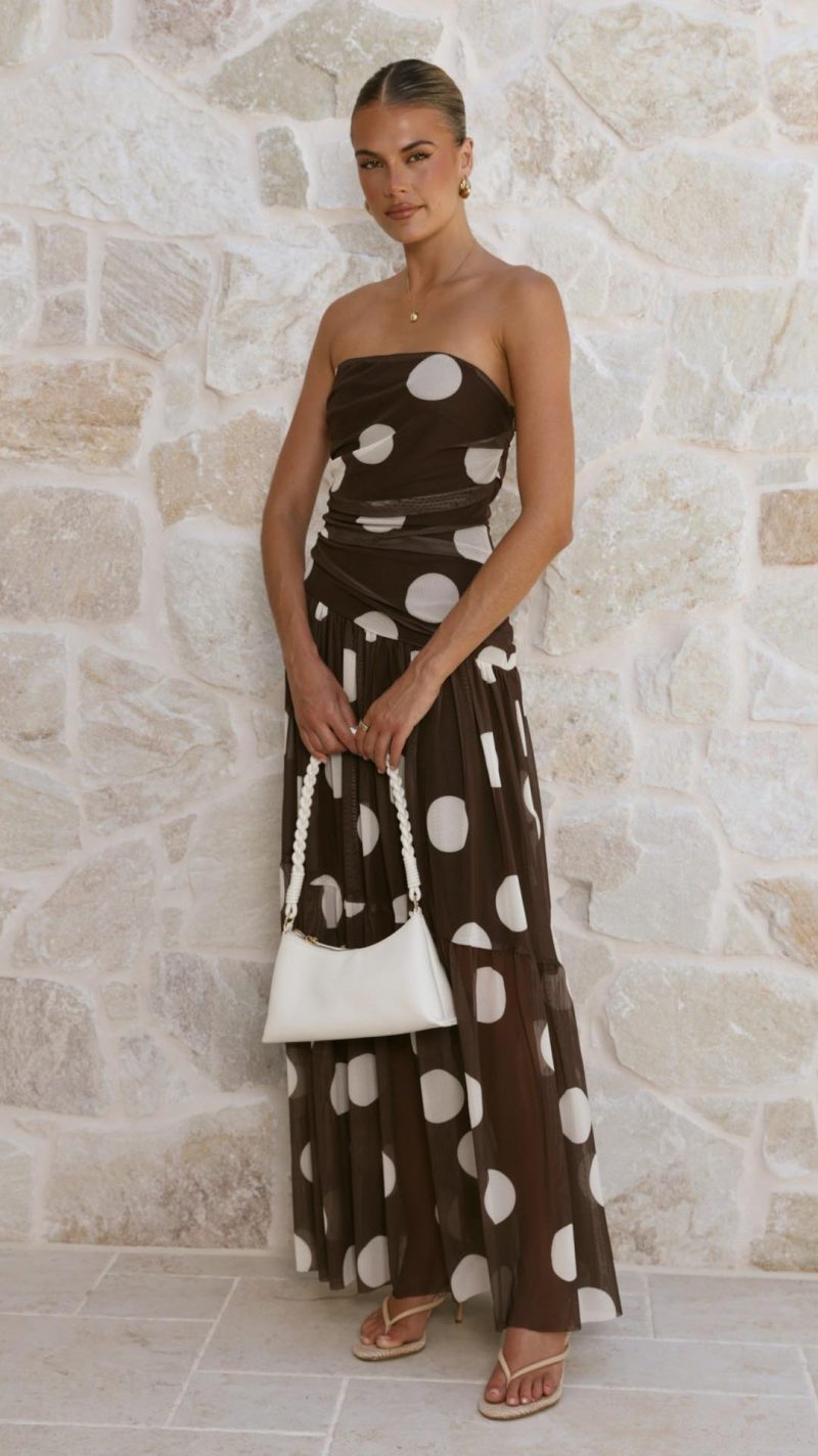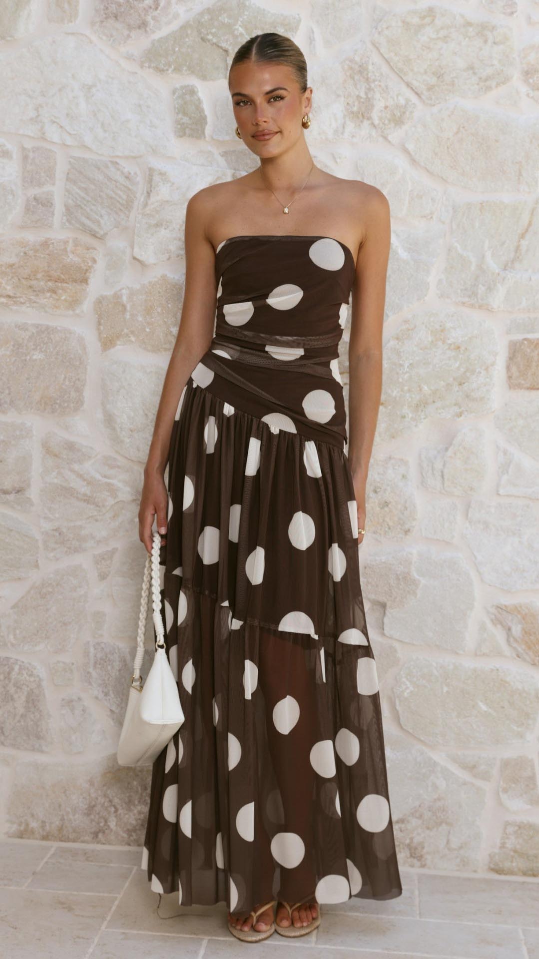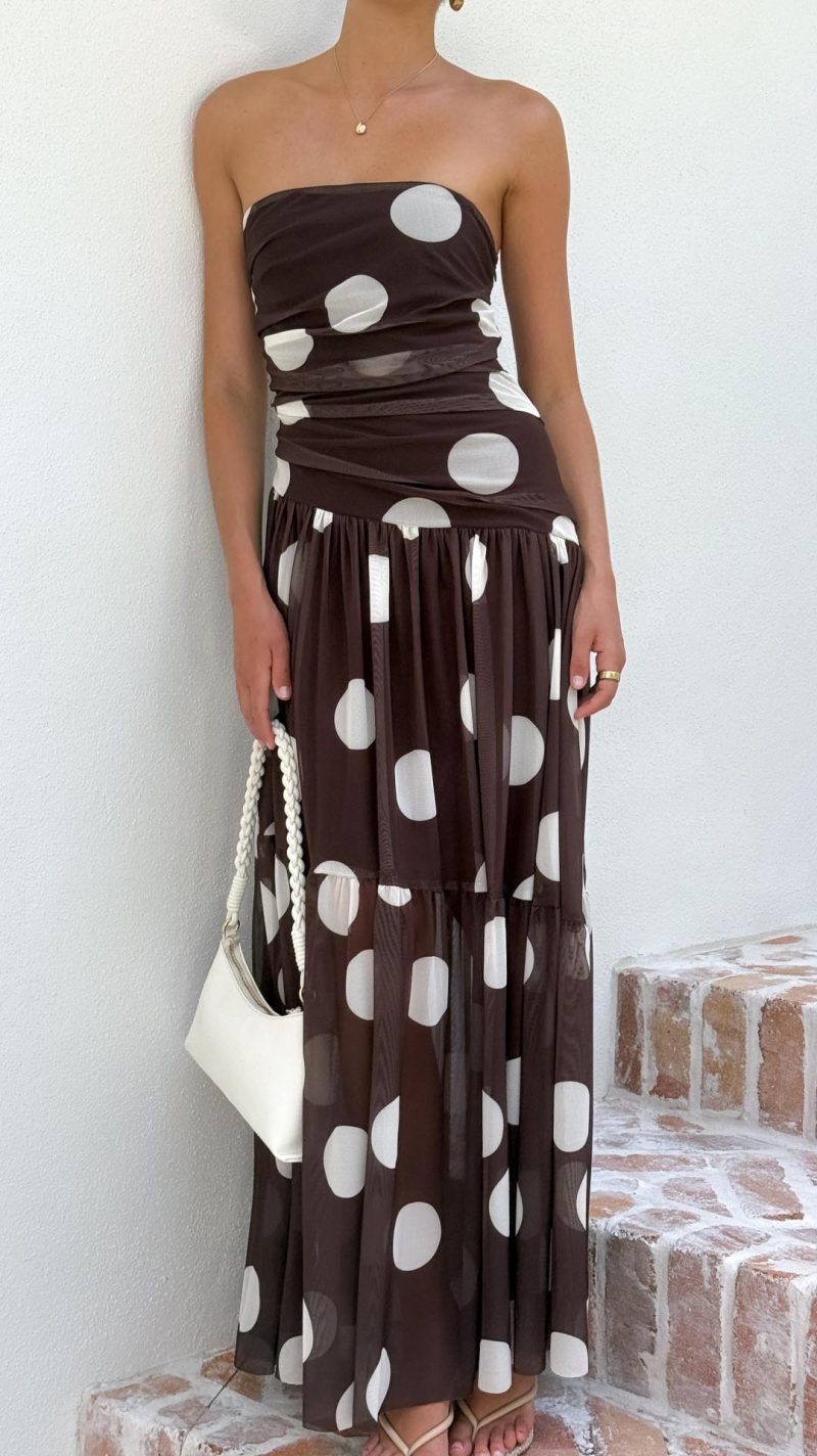 Toperth Chocolate Spot Sheer Overlay Strapless Maxi Dress