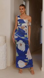 Toperth Dark Blue Floral One-Shoulder Ruched Maxi Dress