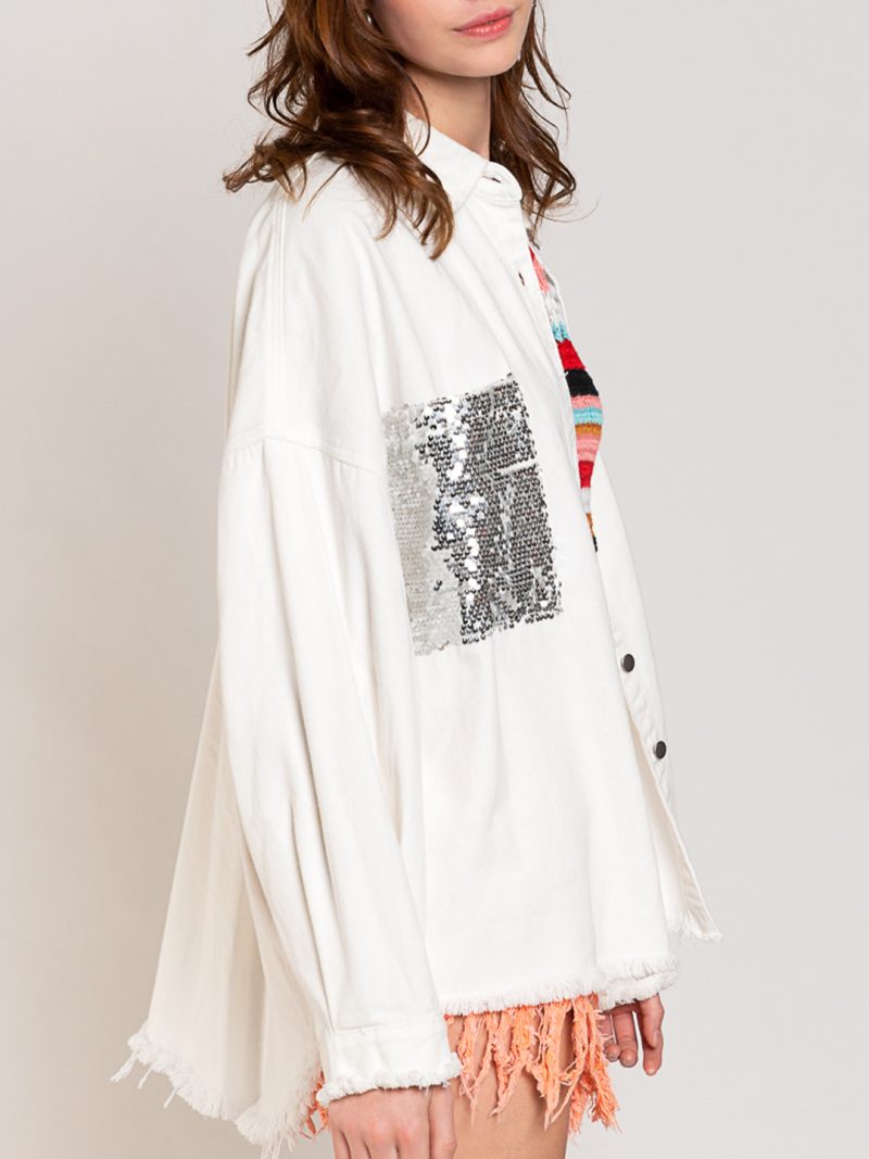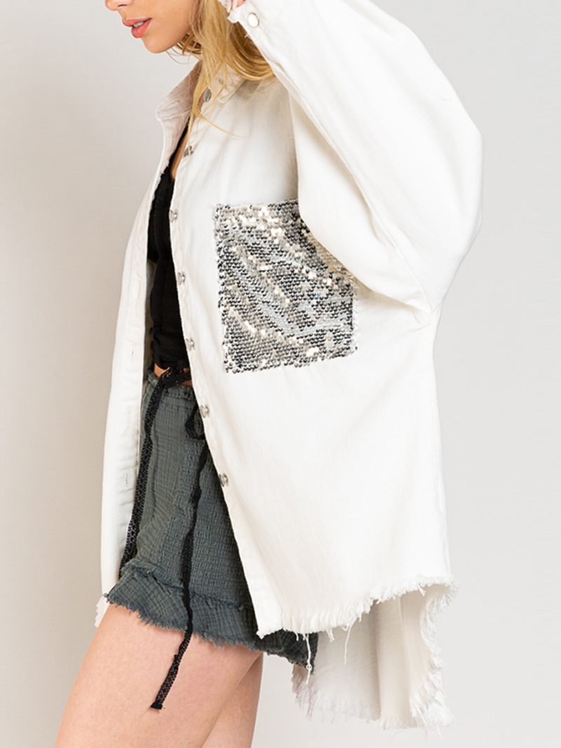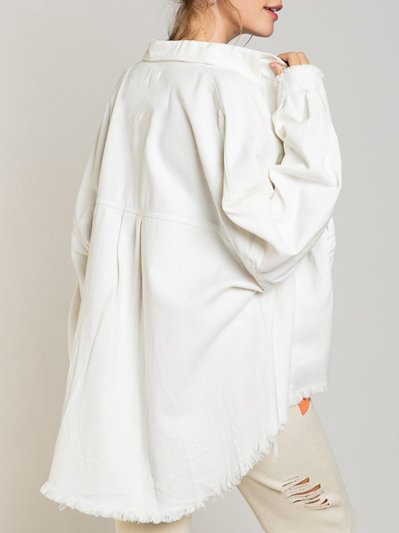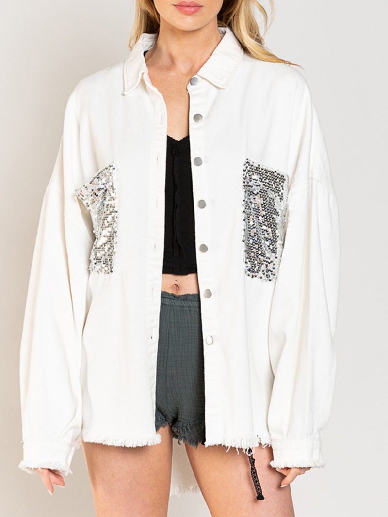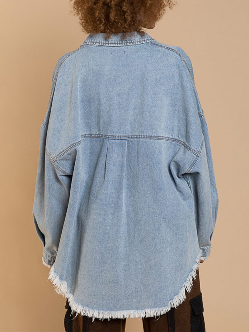 - Long-sleeved denim shirts with lapel collar and two chest pockets