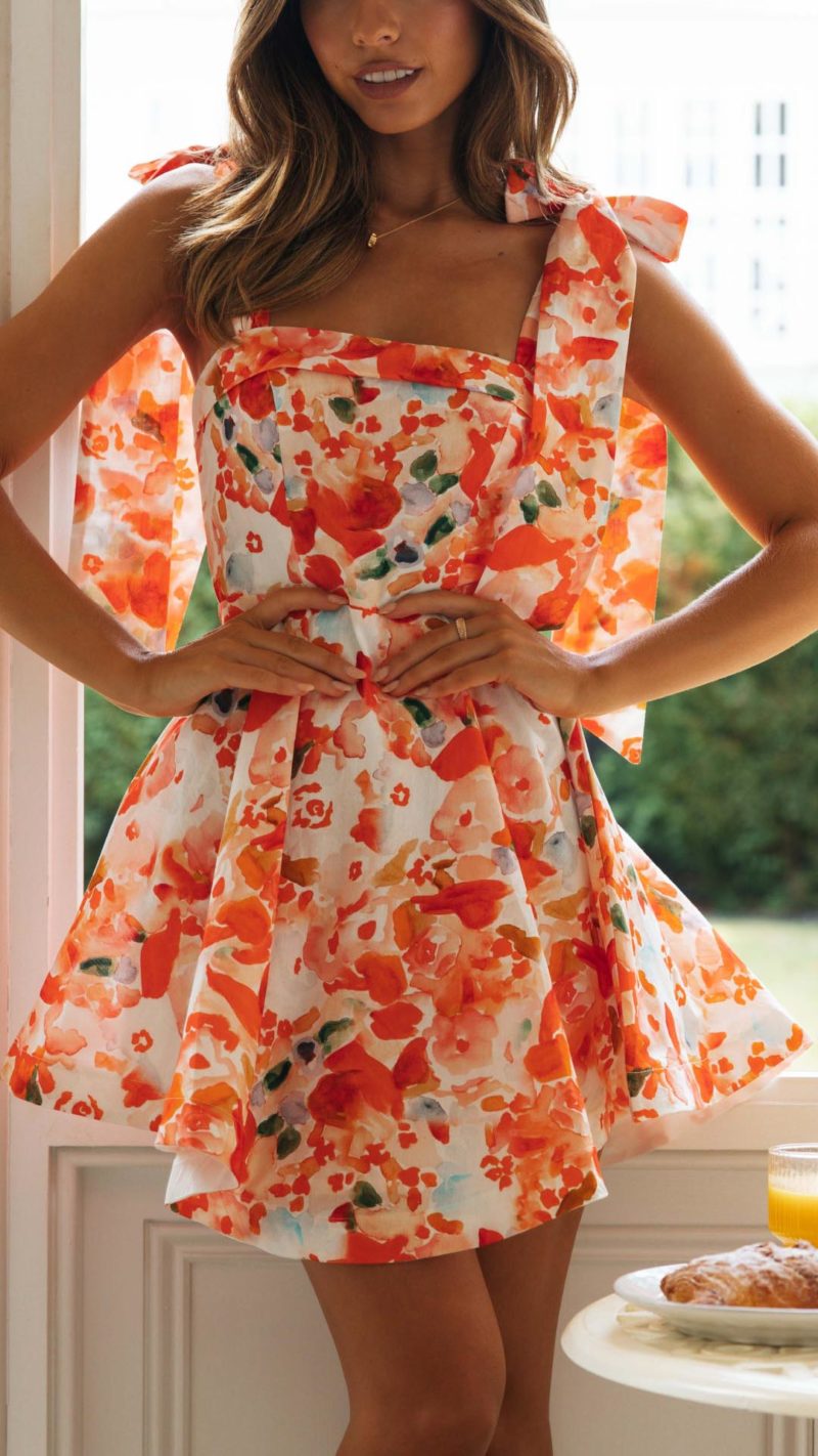 Brighten your wardrobe with this Floral Tie-Strap Mini Dress. Featuring a vibrant red floral print, a straight folded neckline, and charming tie straps, this dress combines elegance with comfort. Perfect for any occasion, its slimming top and flowy skirt will make you stand out.