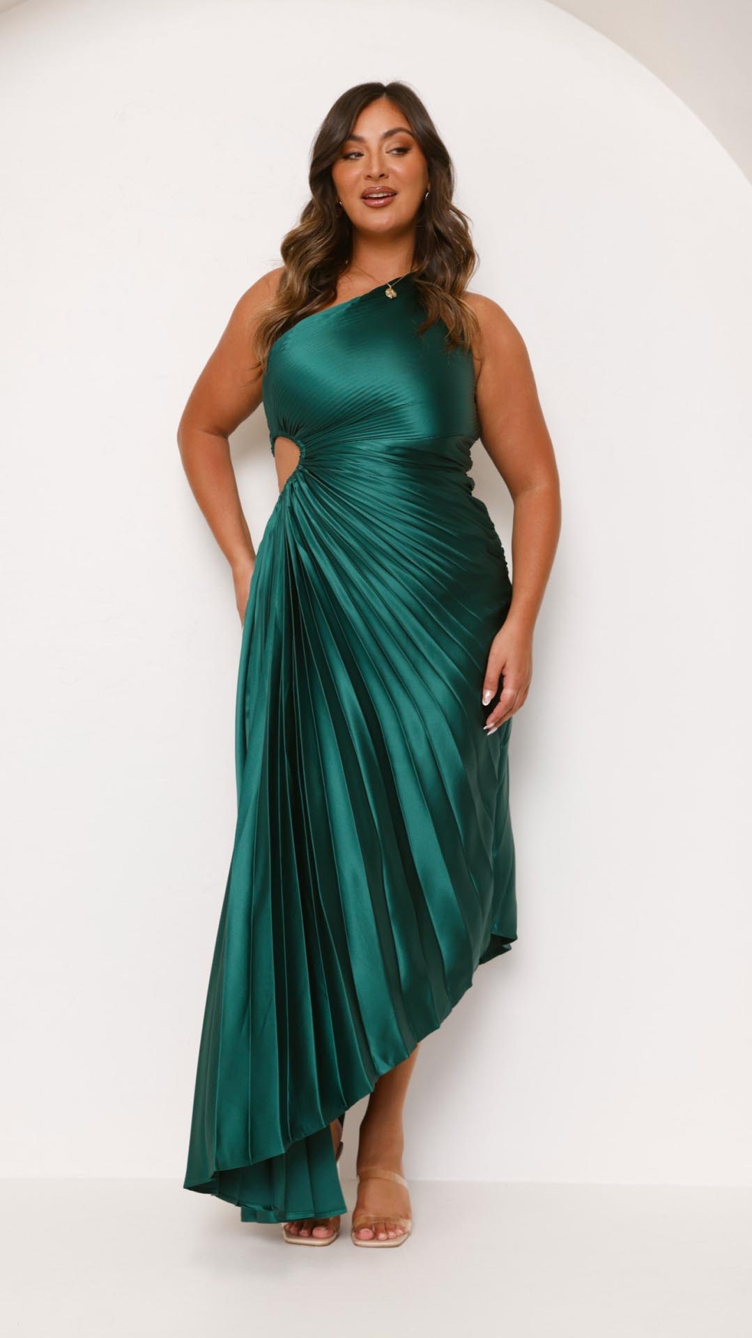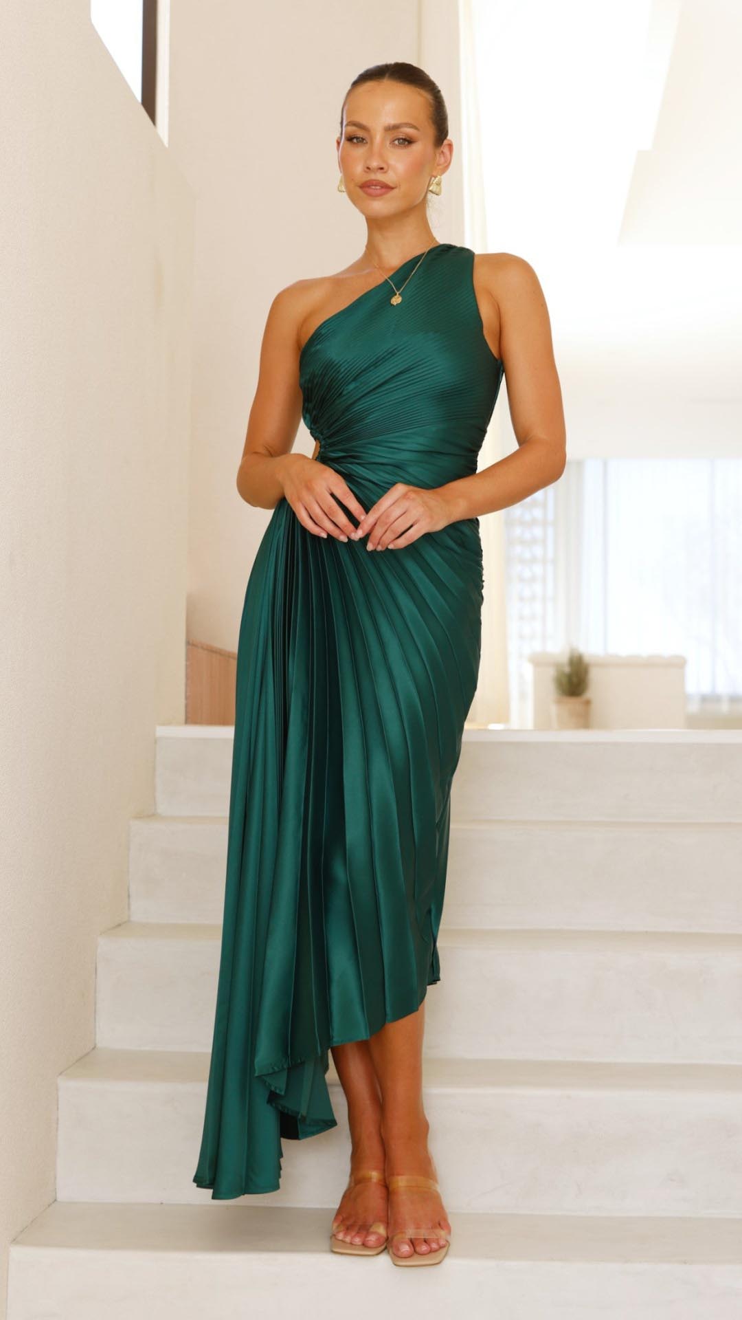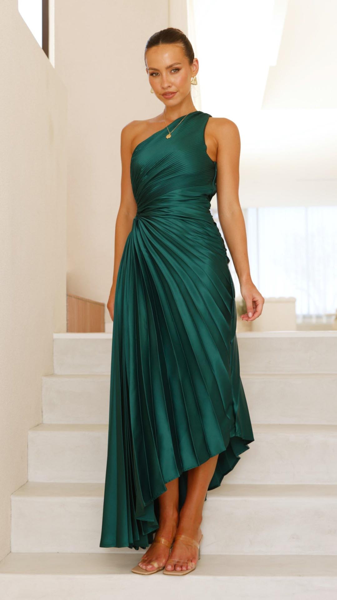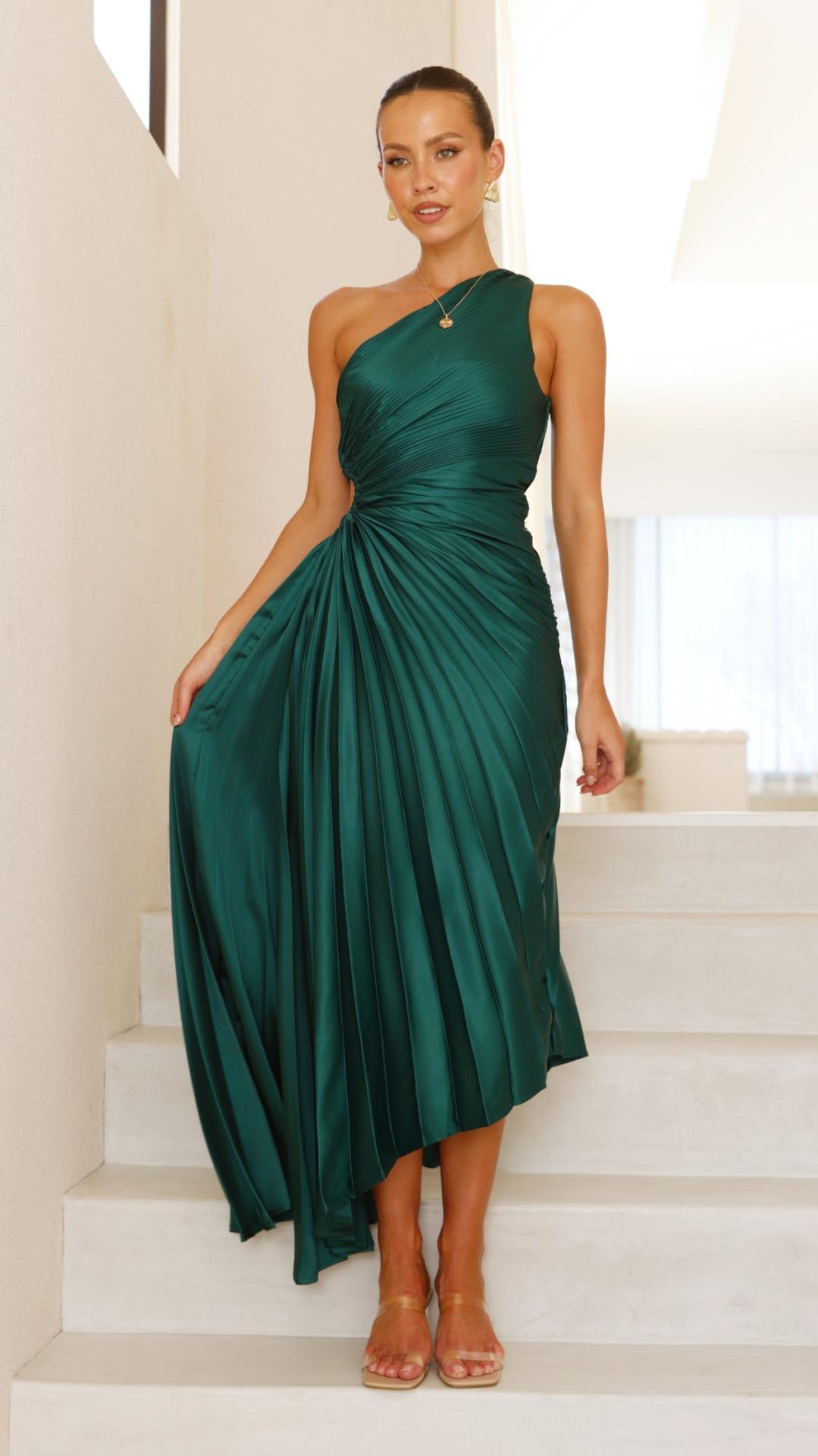 This forest green maxi dress features a chic one-shoulder neckline, an elegant pleated design, and a stylish waist cut-out for a flattering fit. The accordion pleats add movement, while the invisible side zip ensures a seamless silhouette.