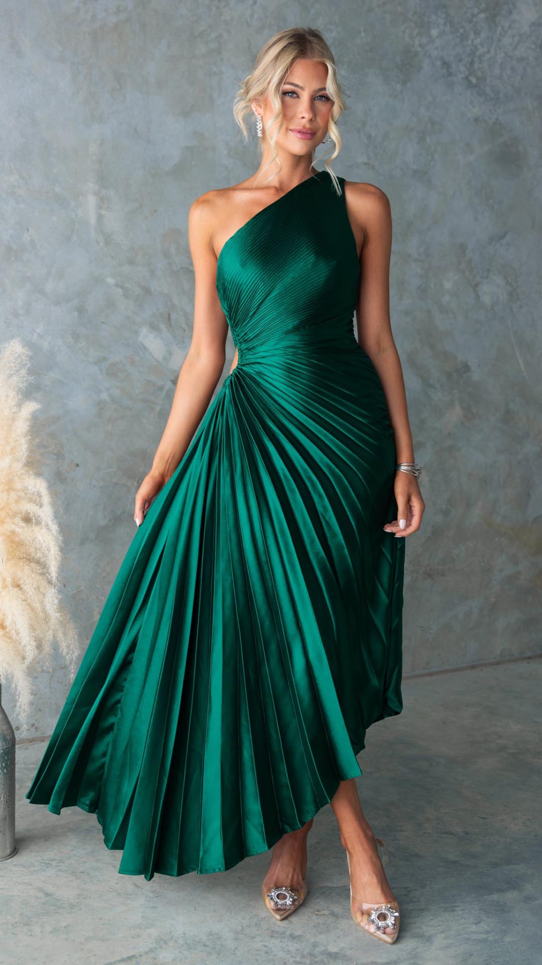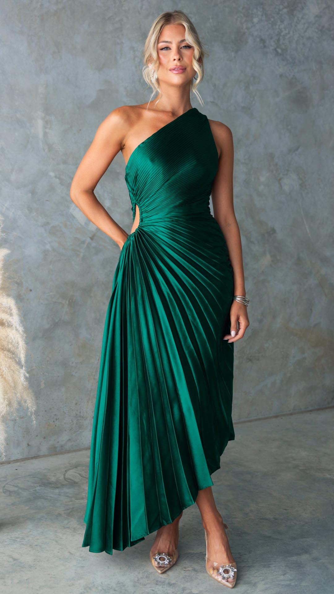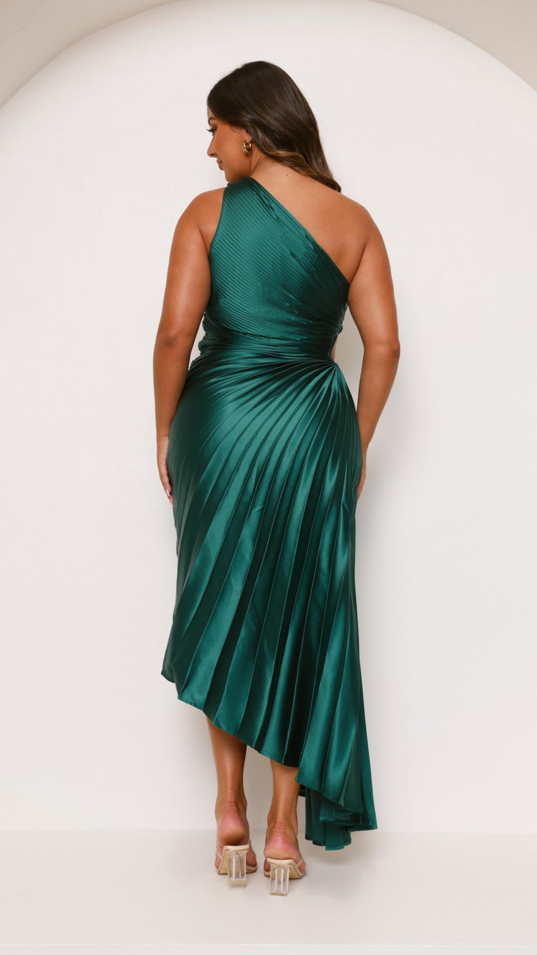 This forest green maxi dress features a chic one-shoulder neckline, an elegant pleated design, and a stylish waist cut-out for a flattering fit. The accordion pleats add movement, while the invisible side zip ensures a seamless silhouette.