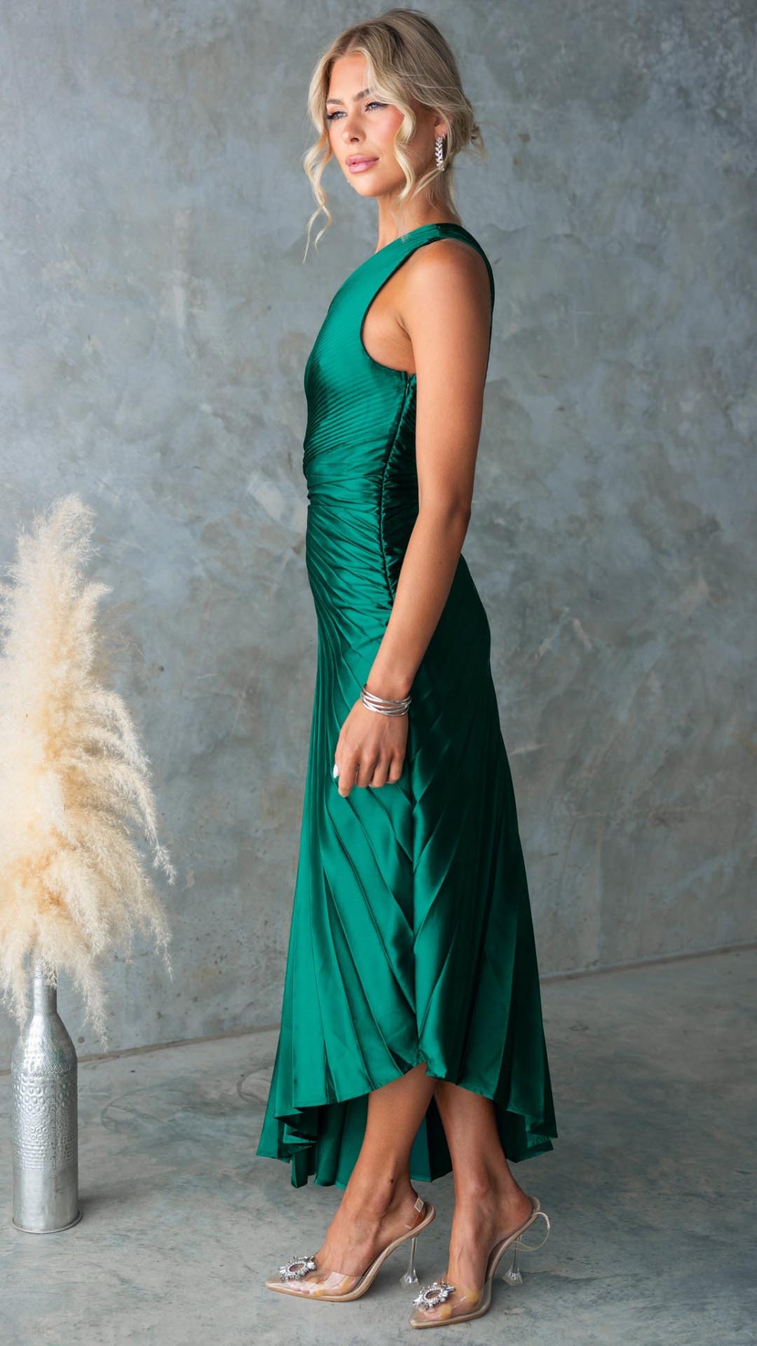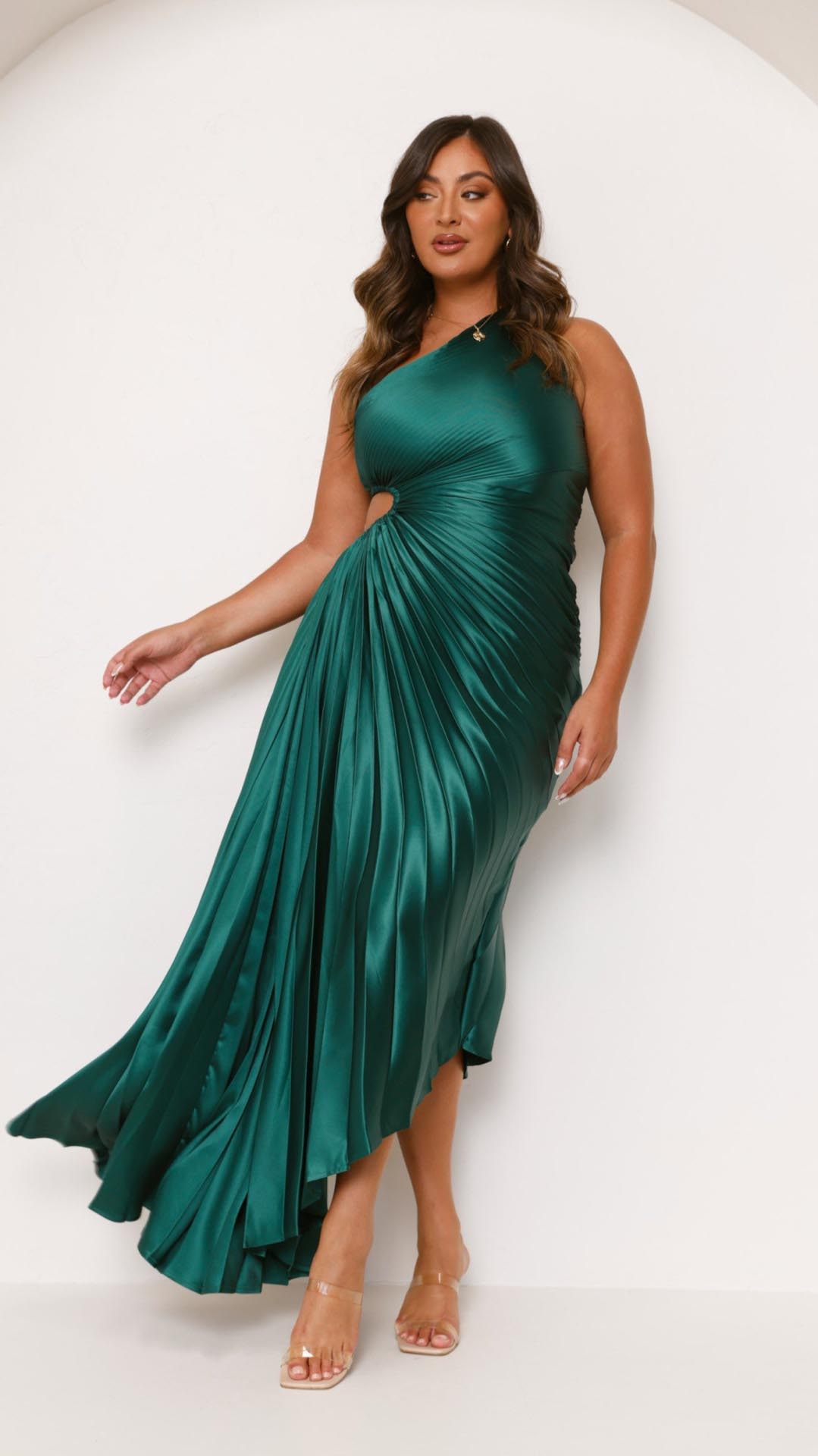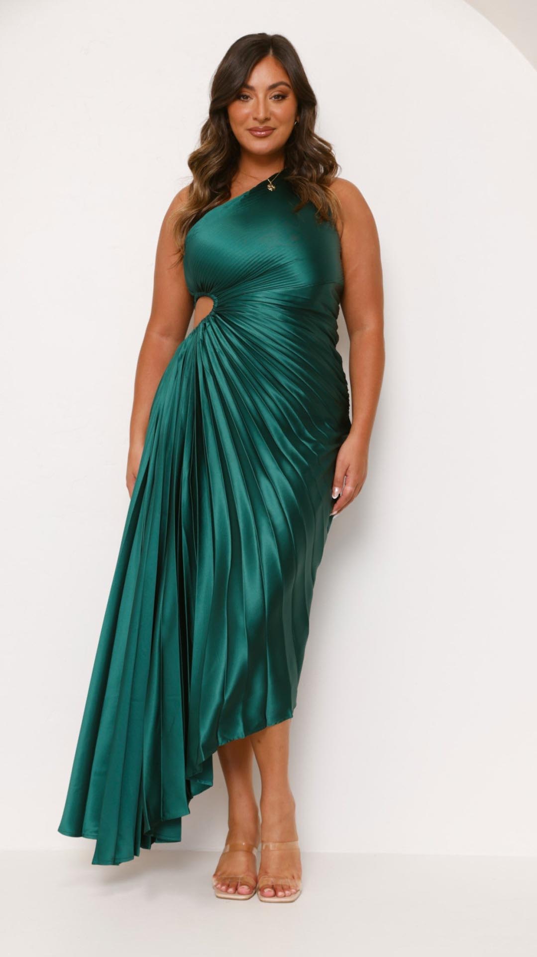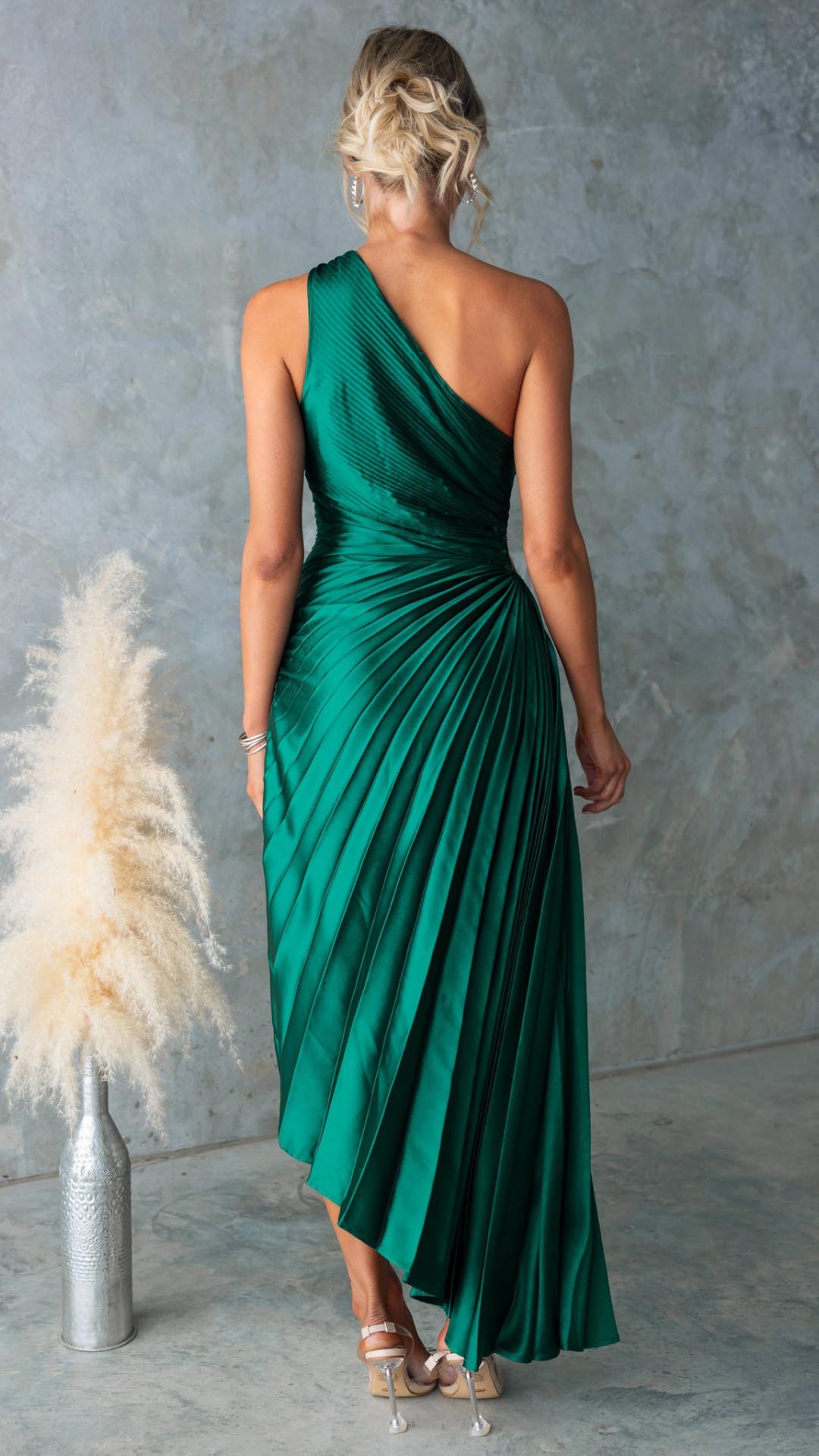 This forest green maxi dress features a chic one-shoulder neckline, an elegant pleated design, and a stylish waist cut-out for a flattering fit. The accordion pleats add movement, while the invisible side zip ensures a seamless silhouette.
