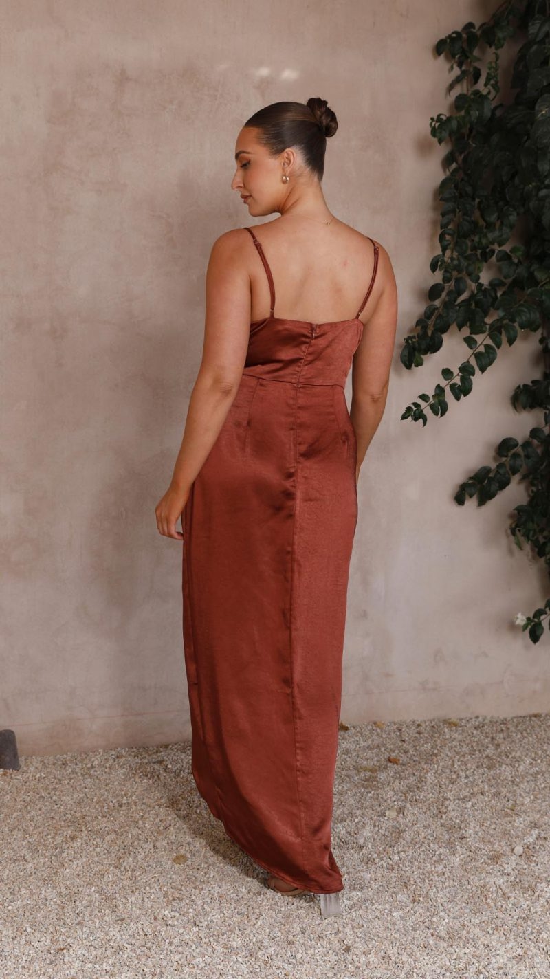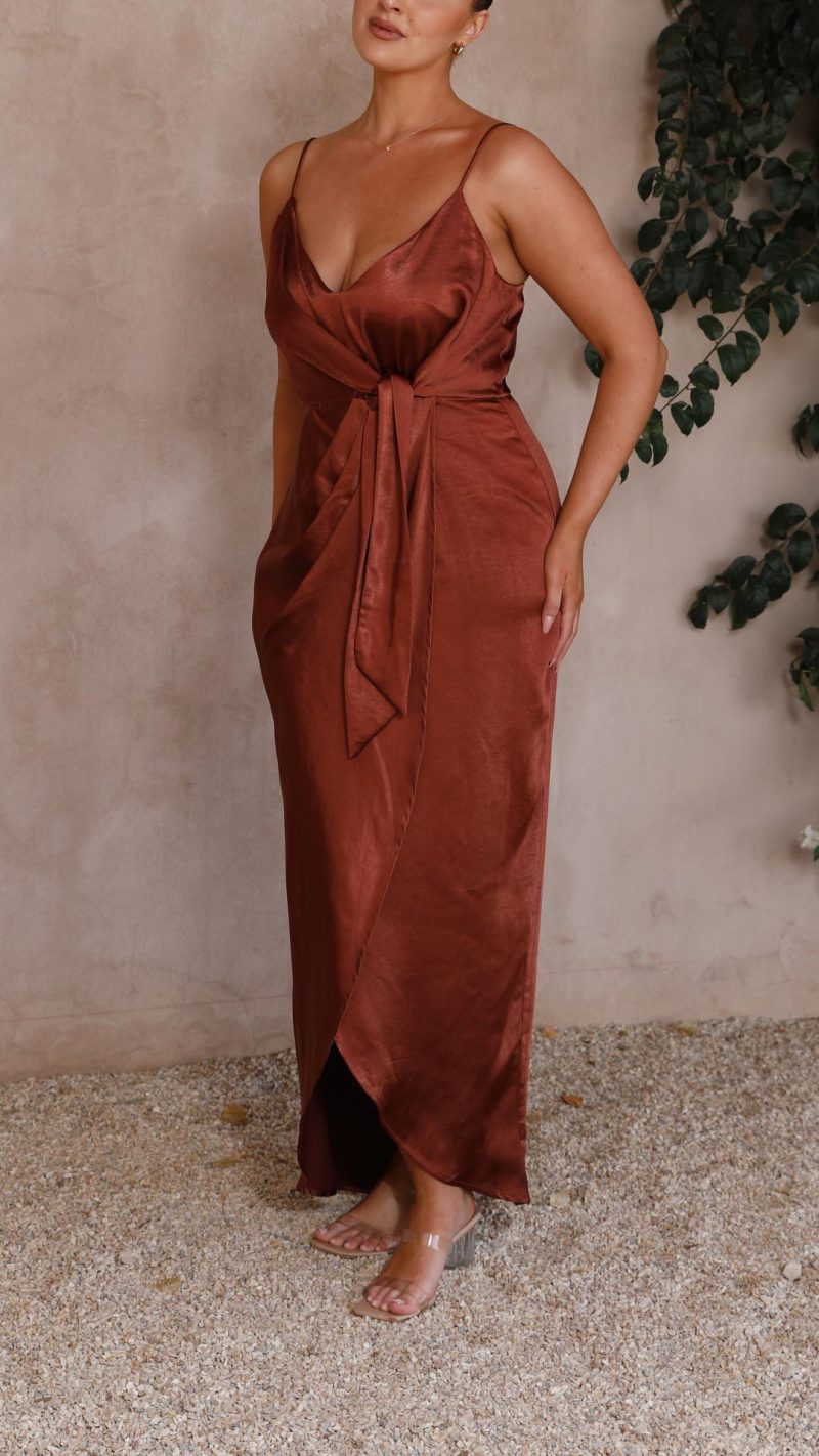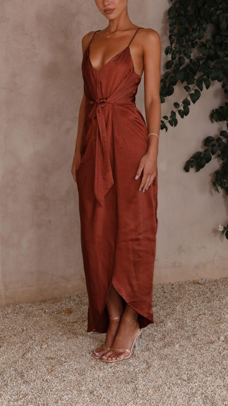 Toperth Glamorous Brown High-Low Hem Satin Maxi Dress