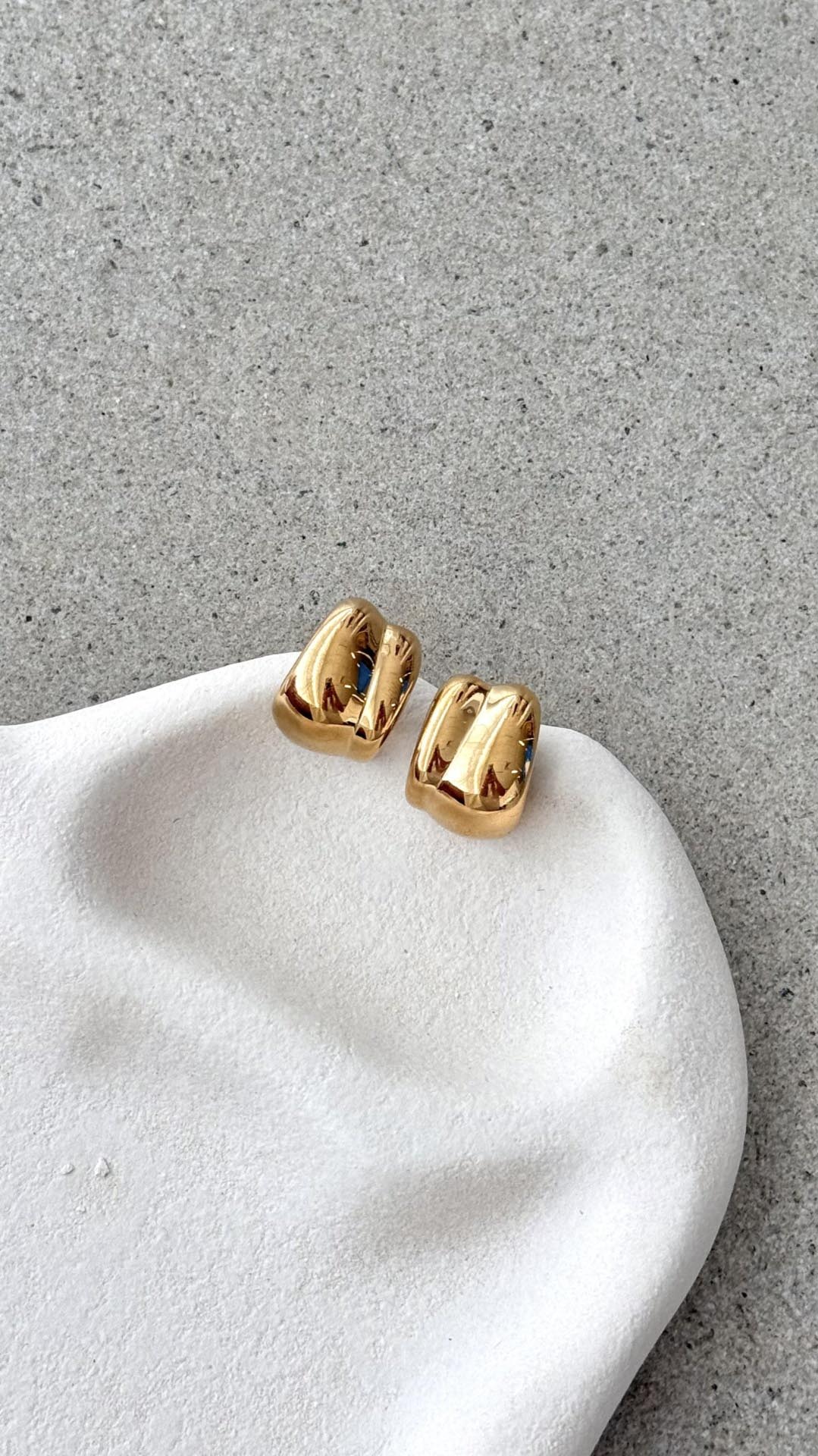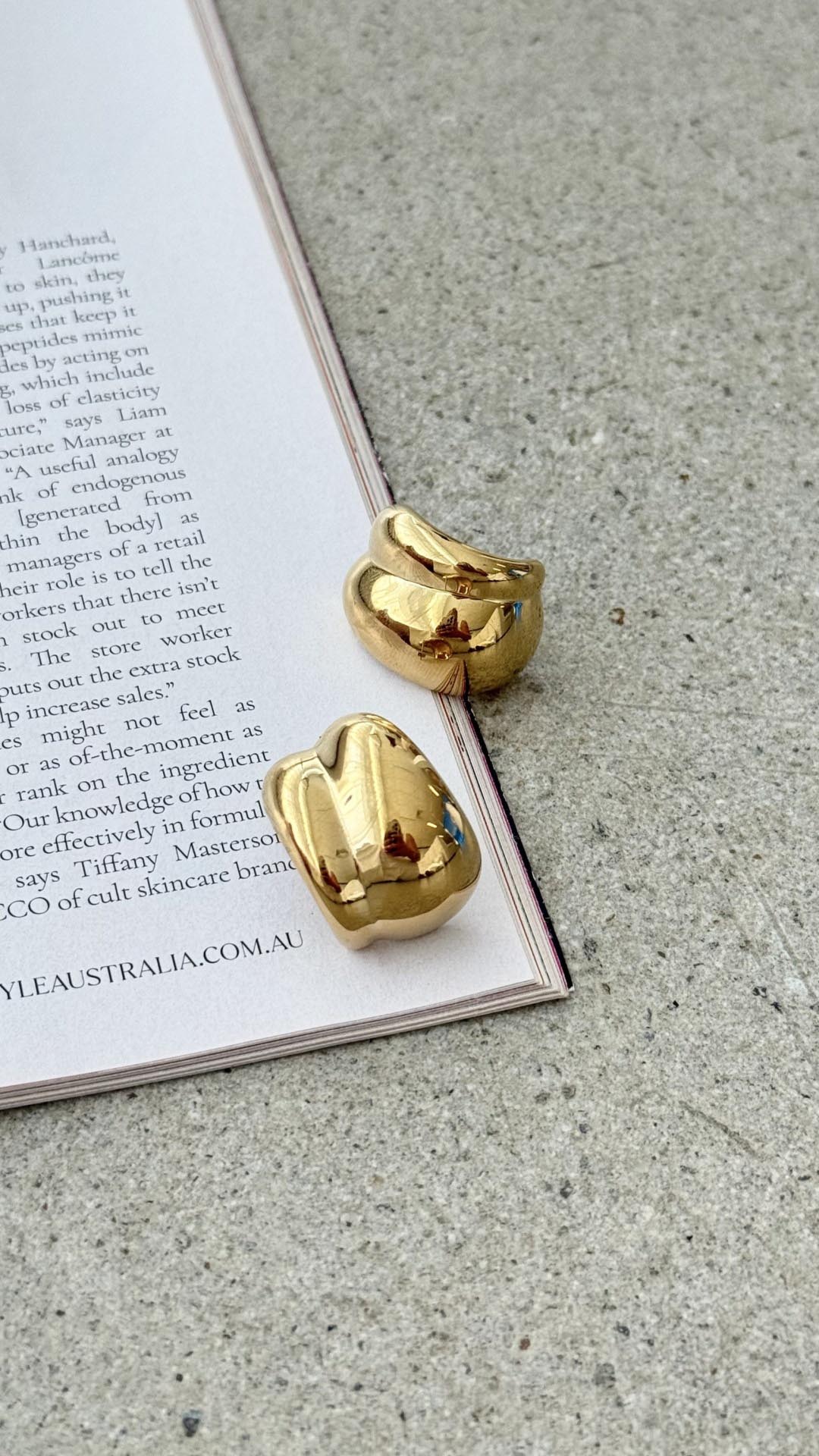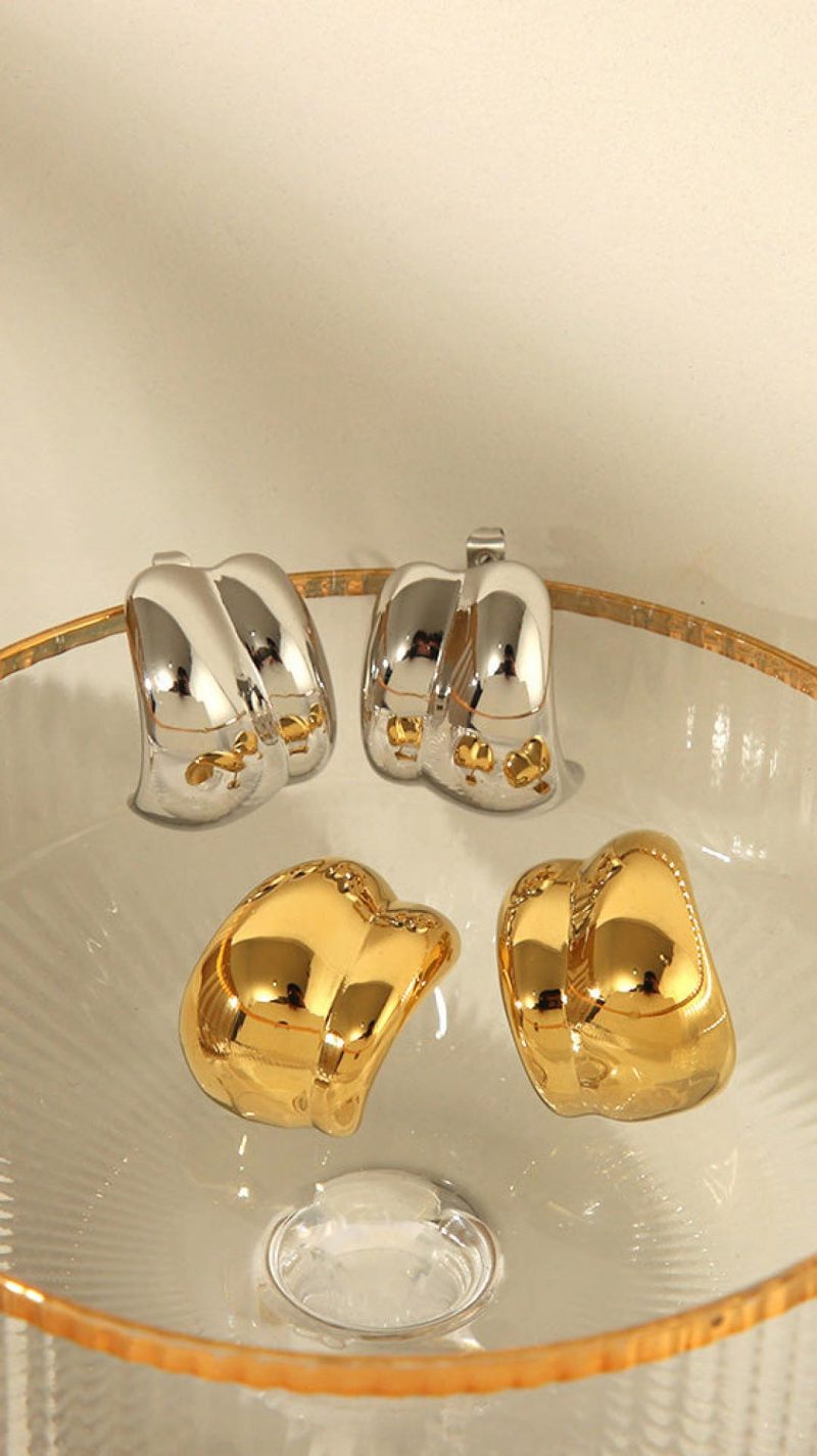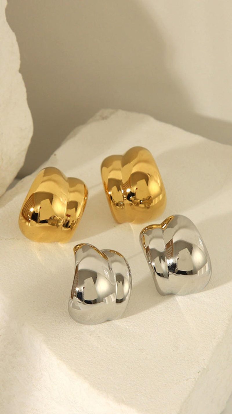 Design Note — Sculptural molten curves define this irregular silhouette, catching light with a fluid, high-polish intensity. The substantial domed profile anchors your daily uniform with organic warmth and secure stud-back ease.