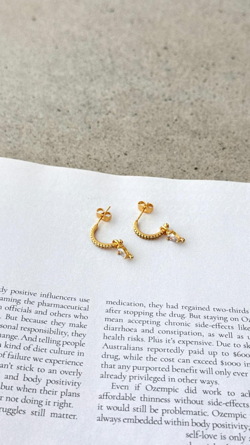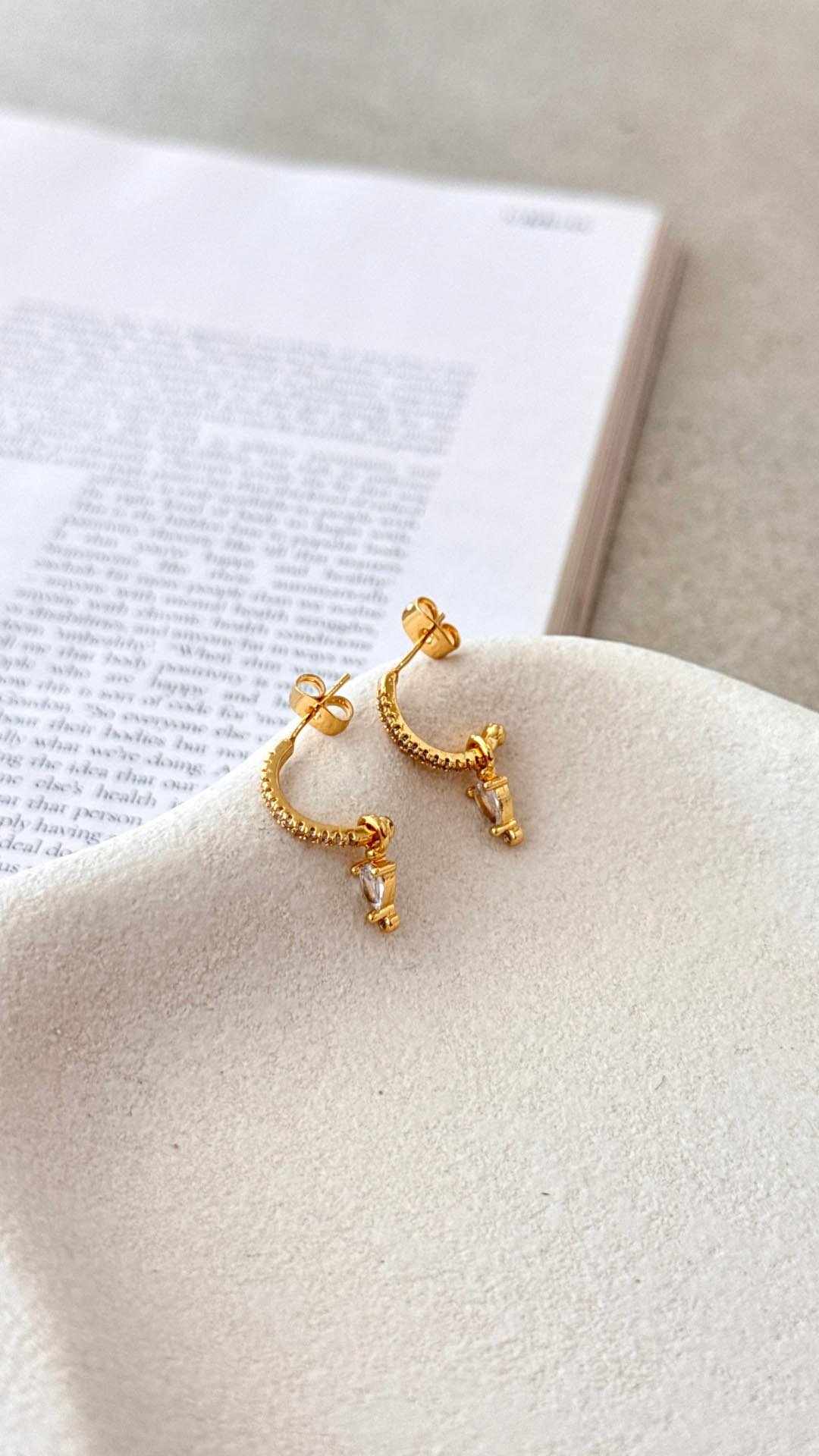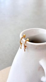 Design Note — Pave-set curves suspend an articulated teardrop charm, catching light with every turn of the head. Cast in 14K-plated stainless steel, the open silhouette secures with a classic post for daily ease.