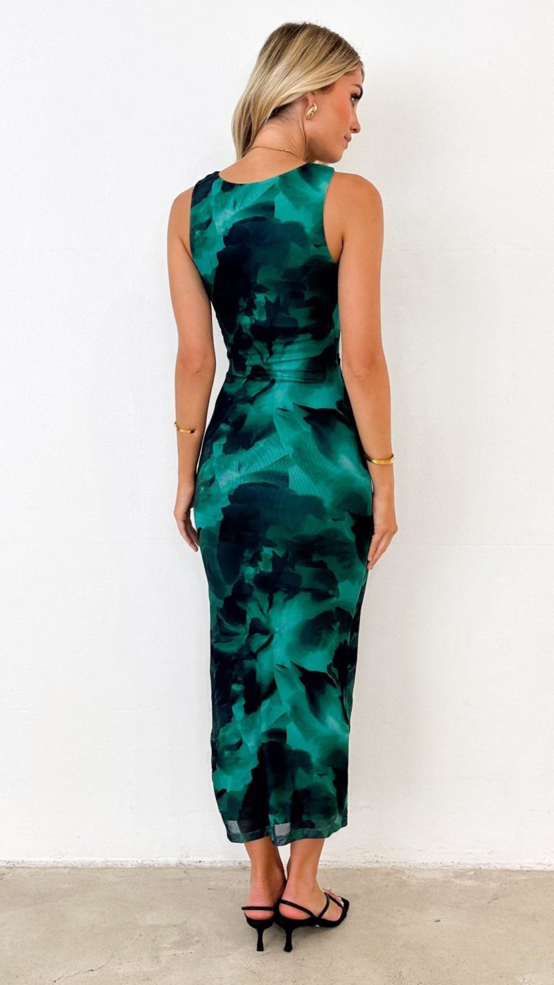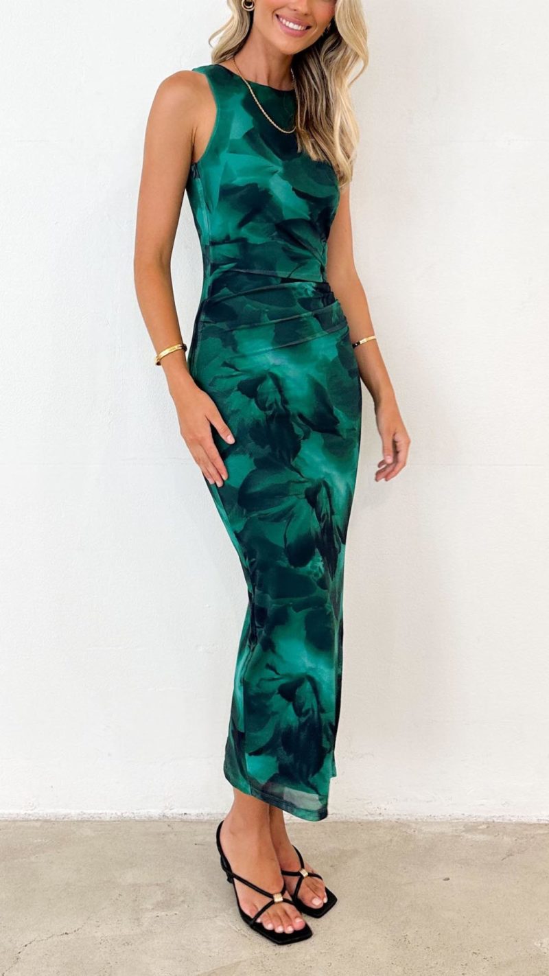 Turn heads in this floral print fitted maxi dress, designed to accentuate your silhouette. With an elasticated neckline, invisible zip closure, and lined stretch fabric, it combines elegance with comfort. Perfect for both casual and special occasions.