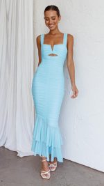 Toperth Light Blue Ruched Mesh Fishtail Maxi Dress
