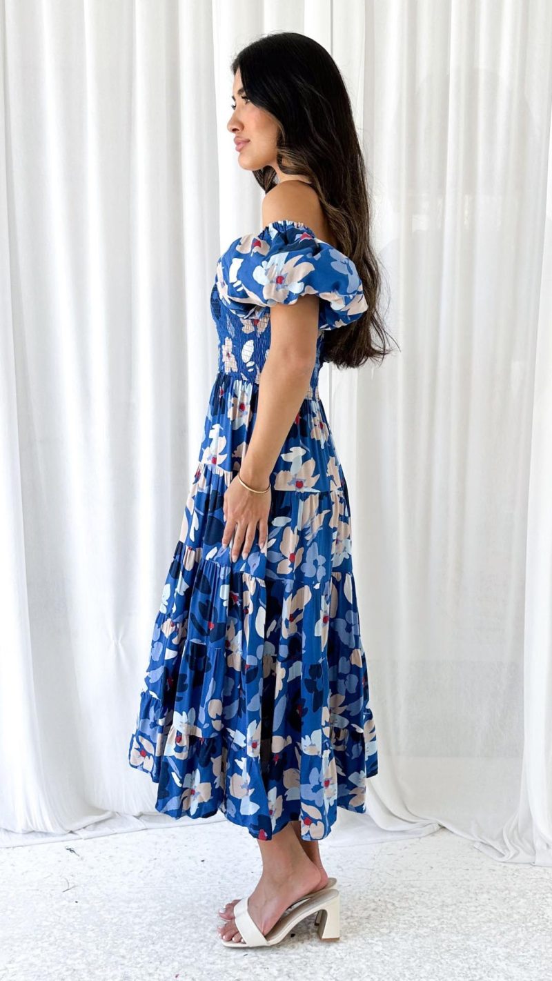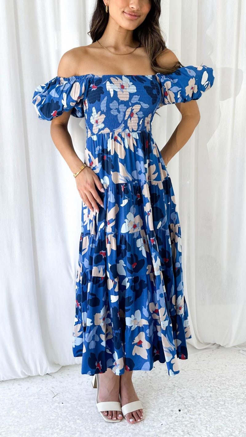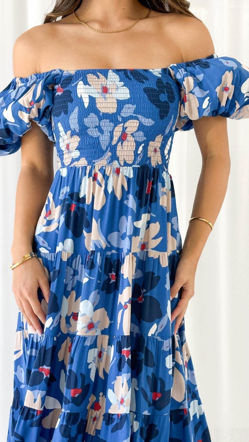 Embrace effortless elegance with this navy floral smocked off-shoulder midi dress! Featuring a fitted shirred bodice, statement puff sleeves, and a flowing tiered skirt, this dress is a must-have for chic and feminine style. Pair it with heels and accessories for a flawless look.