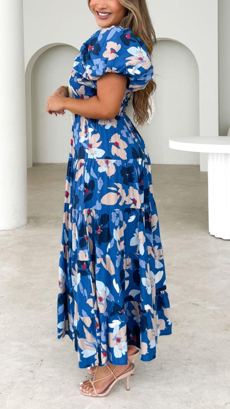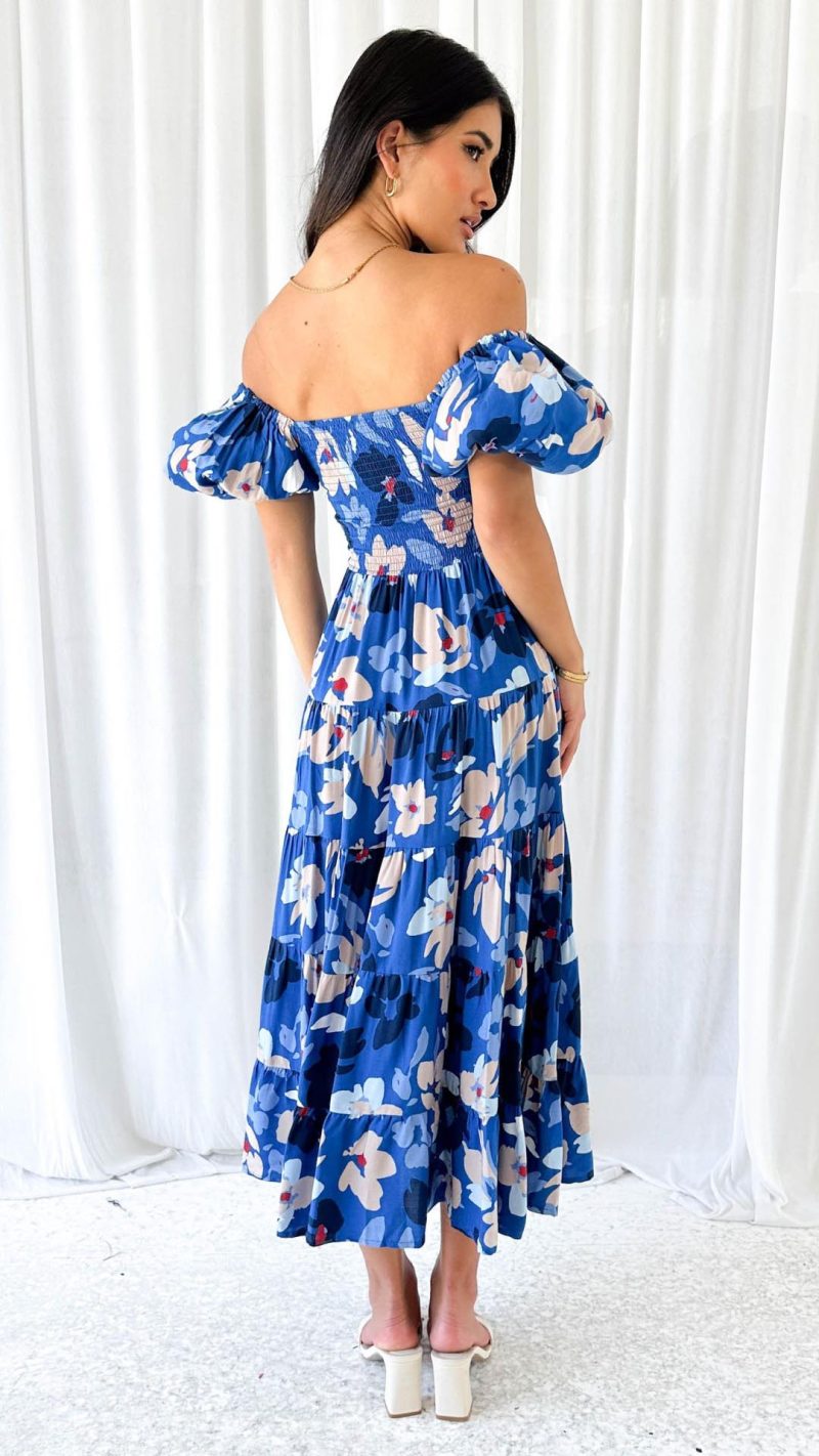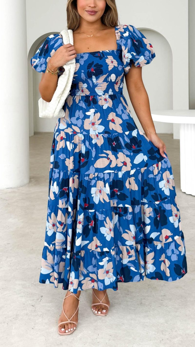 Embrace effortless elegance with this navy floral smocked off-shoulder midi dress! Featuring a fitted shirred bodice, statement puff sleeves, and a flowing tiered skirt, this dress is a must-have for chic and feminine style. Pair it with heels and accessories for a flawless look.