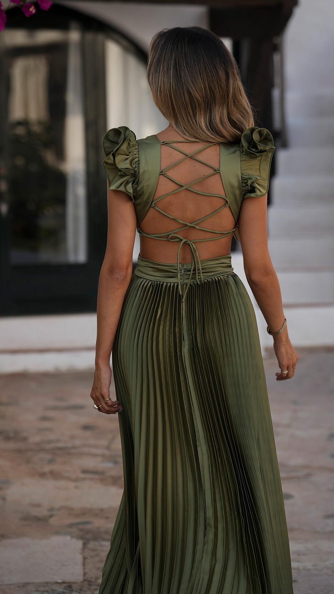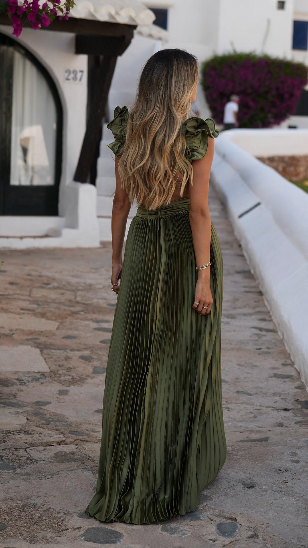 This pleated maxi dress combines romantic ruffle shoulders, a flattering V-neckline, lace-up back, and side cutouts for a truly show-stopping silhouette.