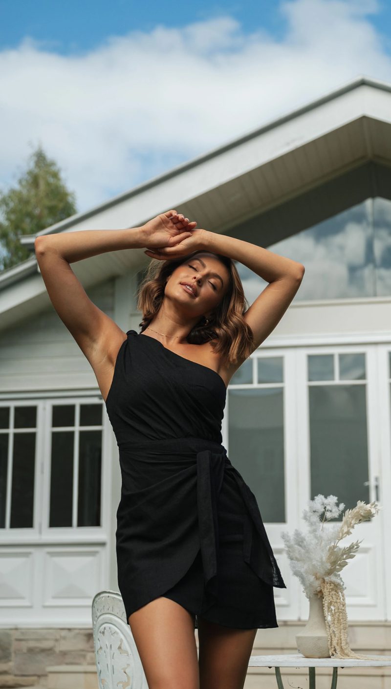 Get ready for this season with this fun mini. This dress has a shoulder detail, waist-ties and an asymmetrical hemline – so while you’re expressing your soft side (you can have a bit of fun). Style yours with white mules and soft curls.