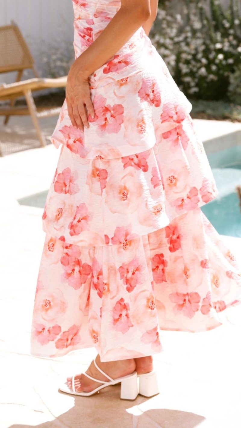 Turn heads with this exquisite floral maxi dress, designed with a dramatic one-shoulder neckline and soft, gathered bust detailing. Its tiered, structured frills add dimension and elegance, while the invisible side zipper ensures a flawless fit for any special occasion.